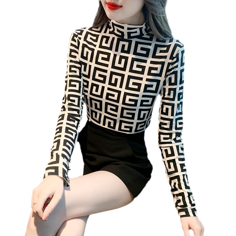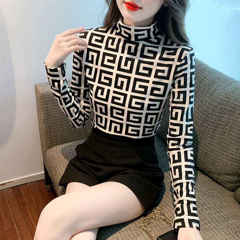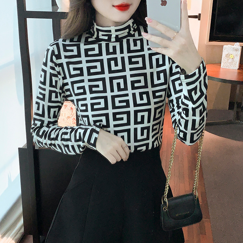 双面德绒半高领修身弹力印花打底衫女磨毛内搭长袖t恤打底小衫潮
