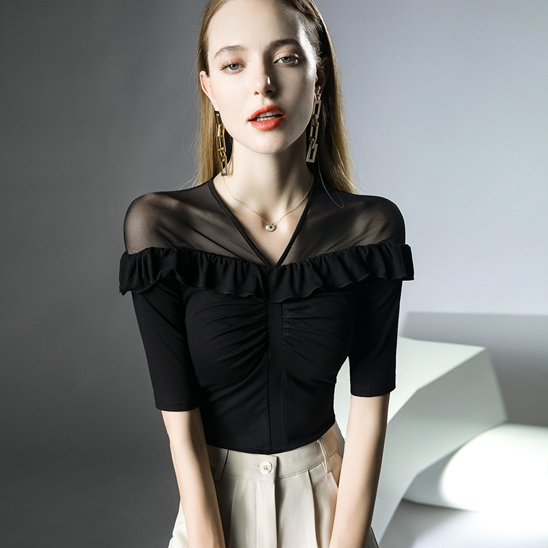 洋气荷叶边上衣春夏新款微透网纱拼接褶皱半袖