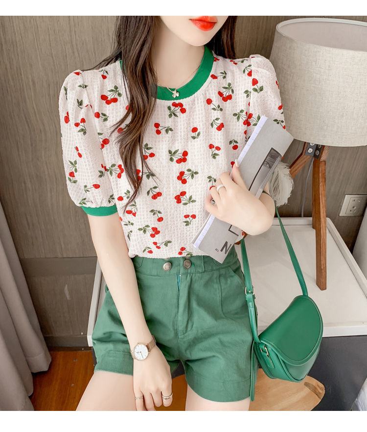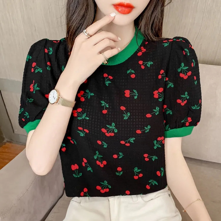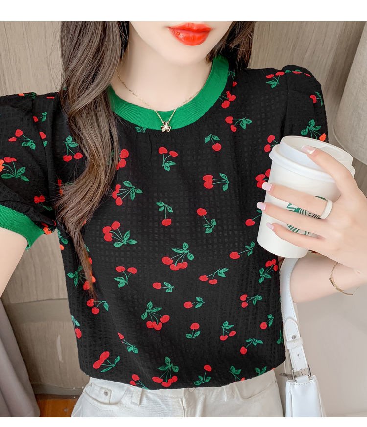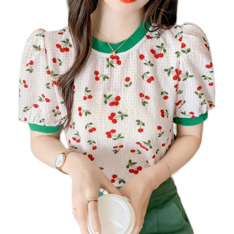 小清新甜美樱桃冰丝短袖t恤女夏季小个子宽松洋气减龄泡泡袖上衣
