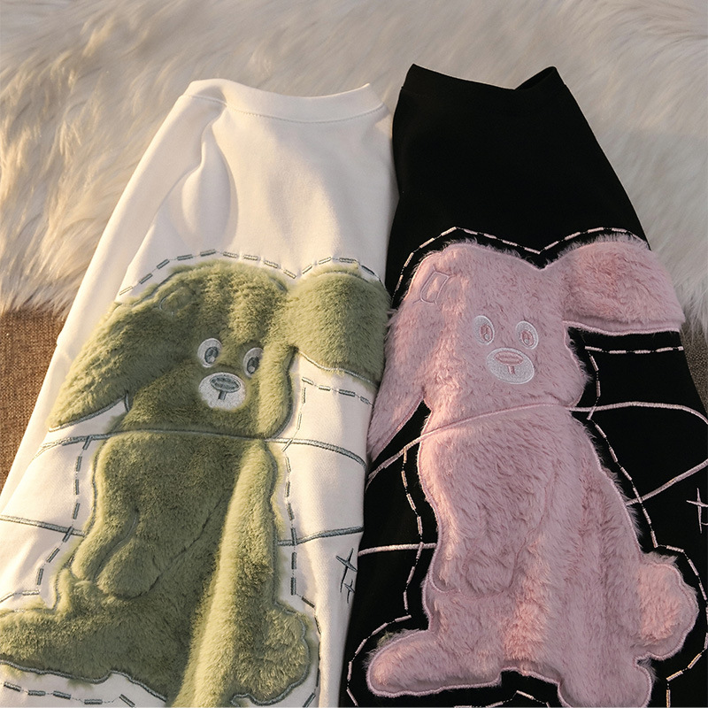 重工刺绣国潮牌毛绒兔子短袖T恤女夏季宽松大版显瘦短款半袖上衣