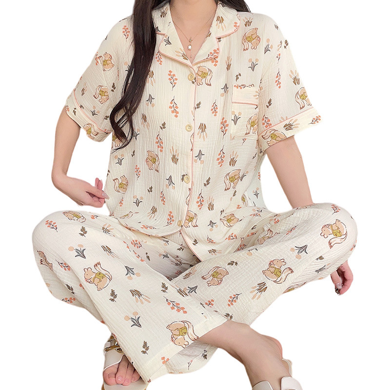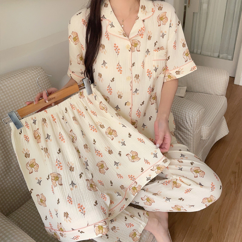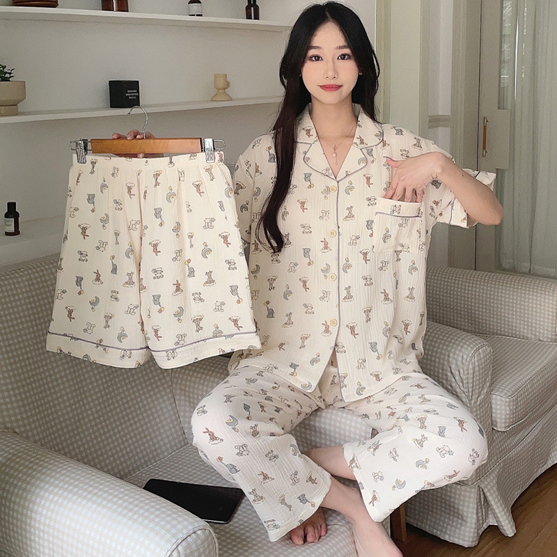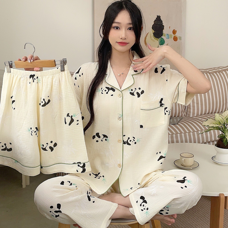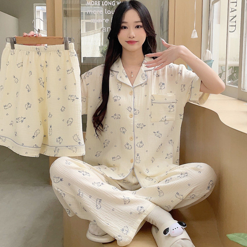 睡衣女春夏款短袖短裤棉纱休闲三件套装家居服长裤薄款学生空调服