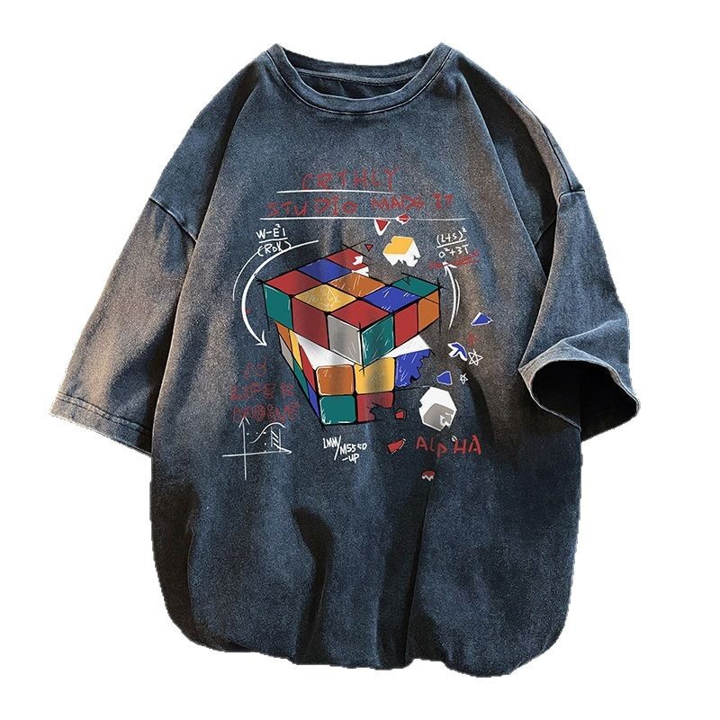 魔方水洗做旧重磅短袖t恤女夏季ins潮牌宽松衣服美式复古大码半袖