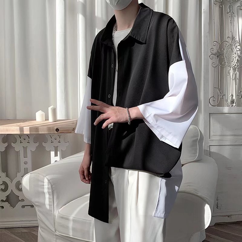 夏季新款冰丝短袖衬衫男设计感小众拼色七分港风宽松潮牌休闲衬衣