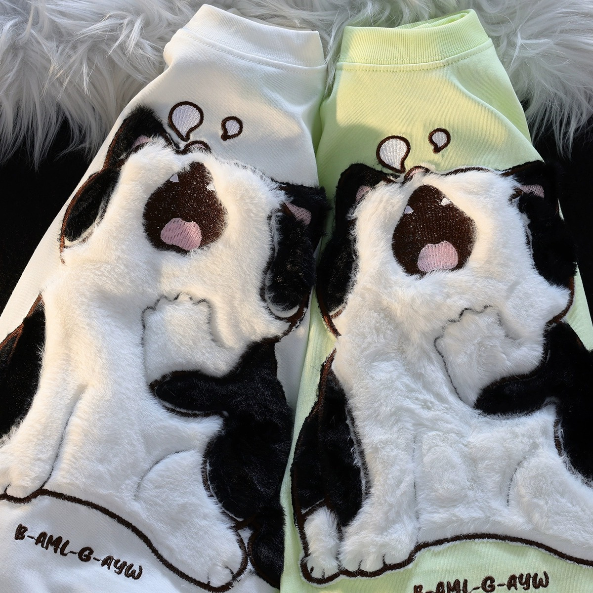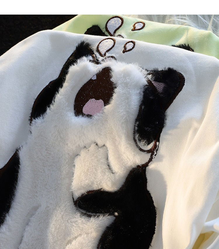日系复古瞌睡猫咪植绒短袖T恤男女小众设计感潮牌oversize情侣装