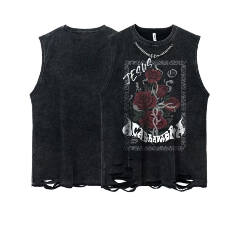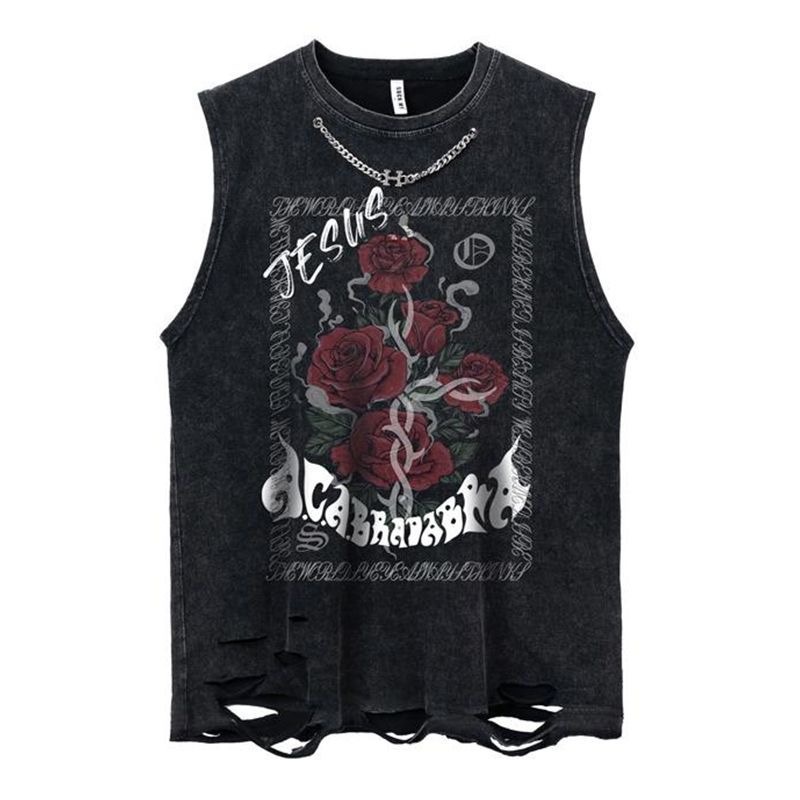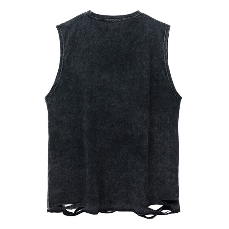 夏季欧美复古风做旧水洗坎肩破洞汗背心男女ins潮牌嘻哈无袖T恤衫