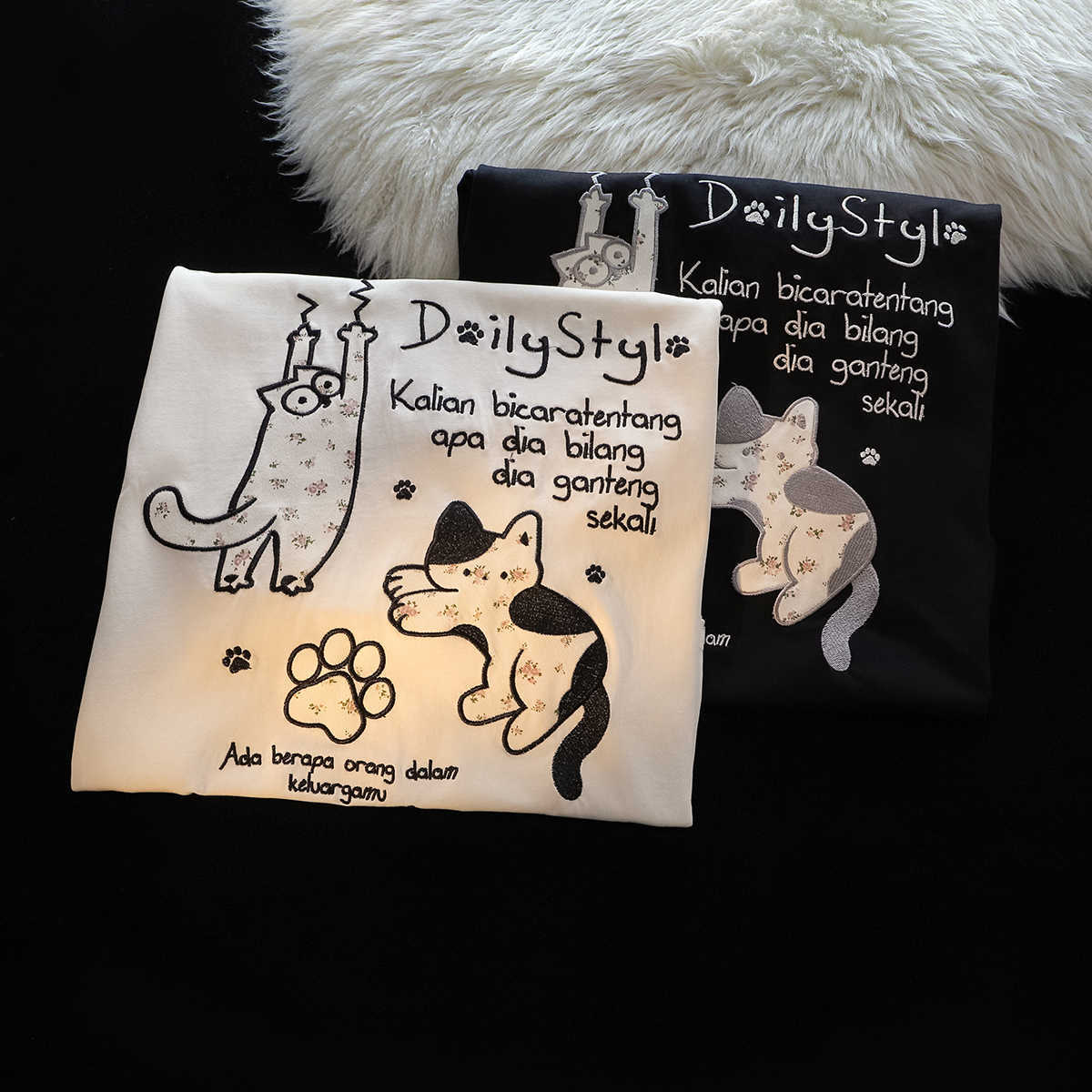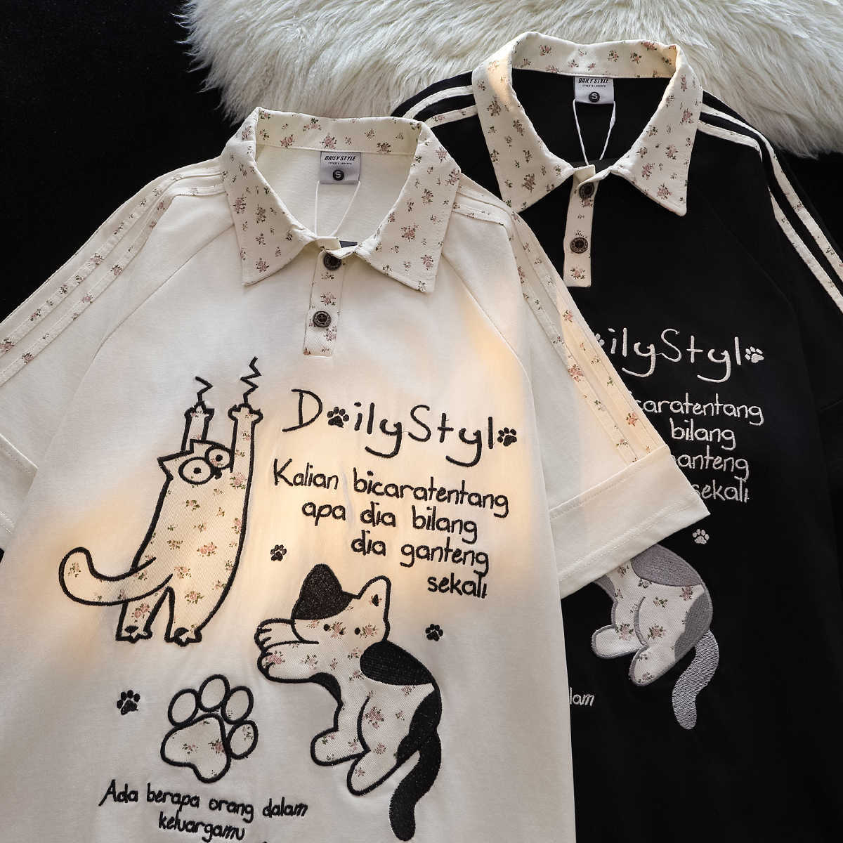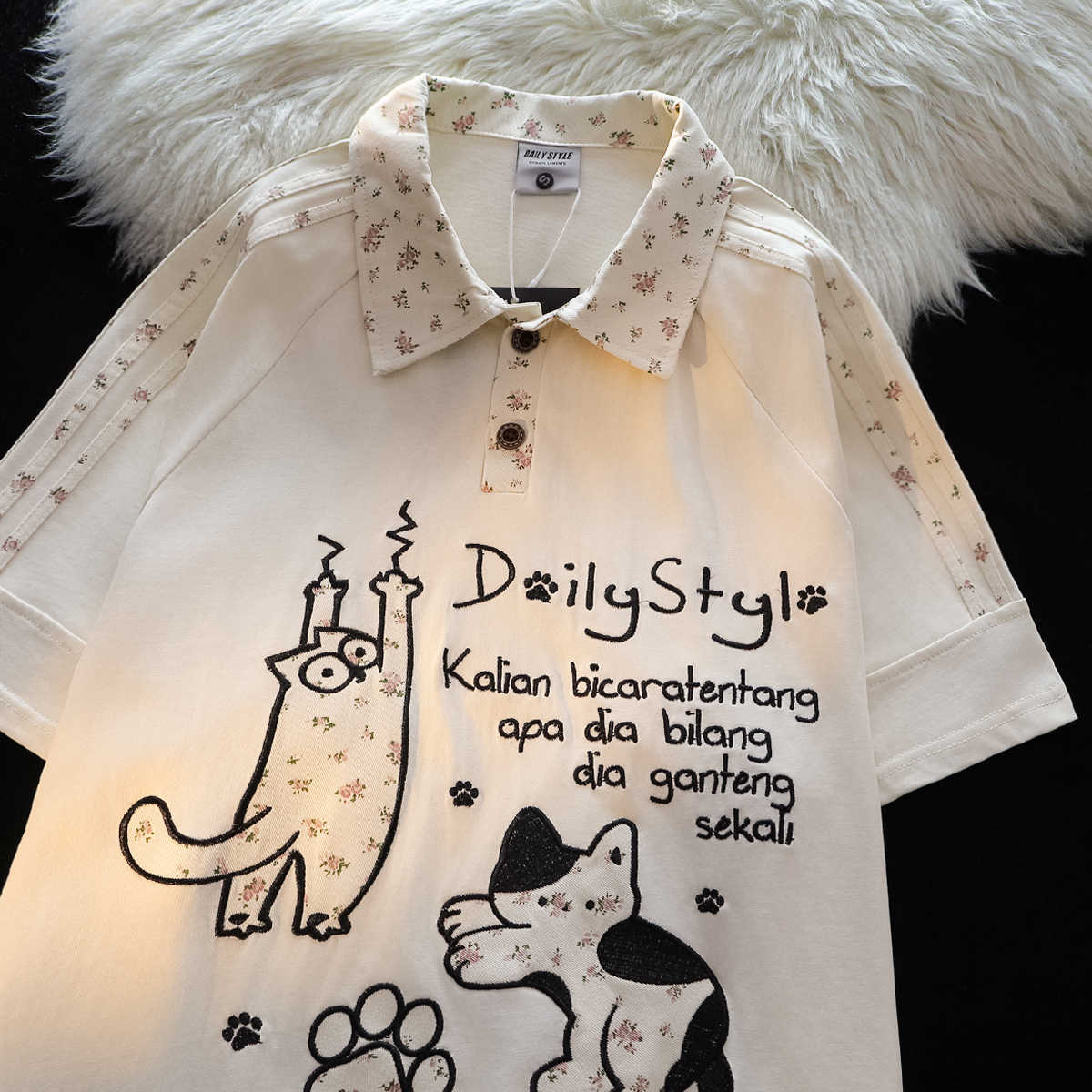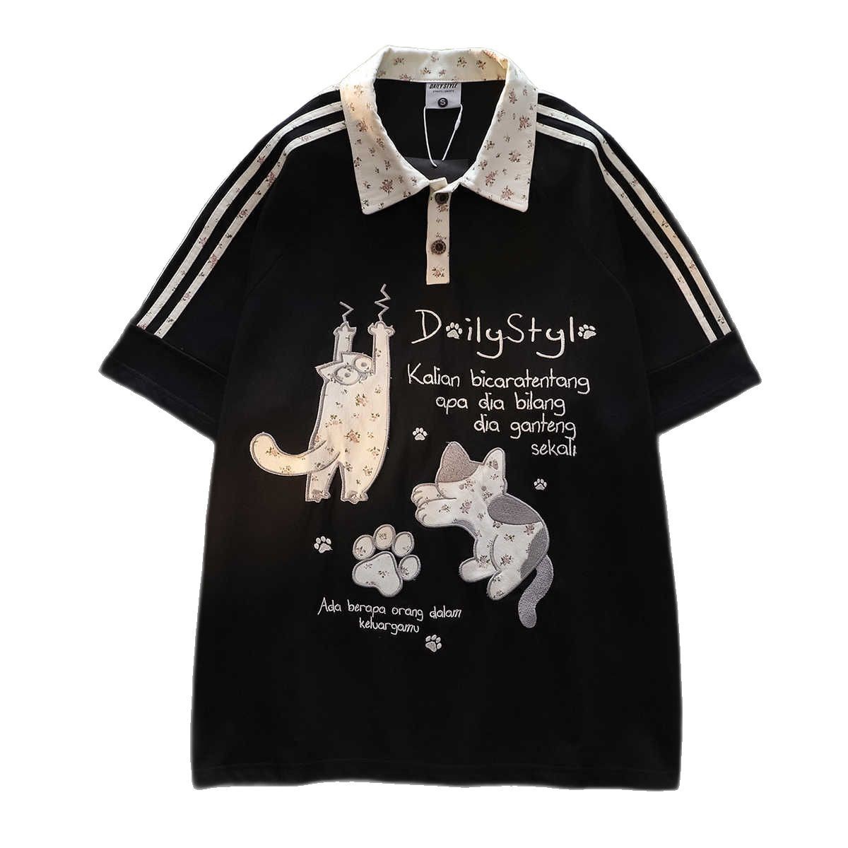 美式可爱猫咪刺绣短袖t恤女夏季设计感小众学院风拼接polo领上衣