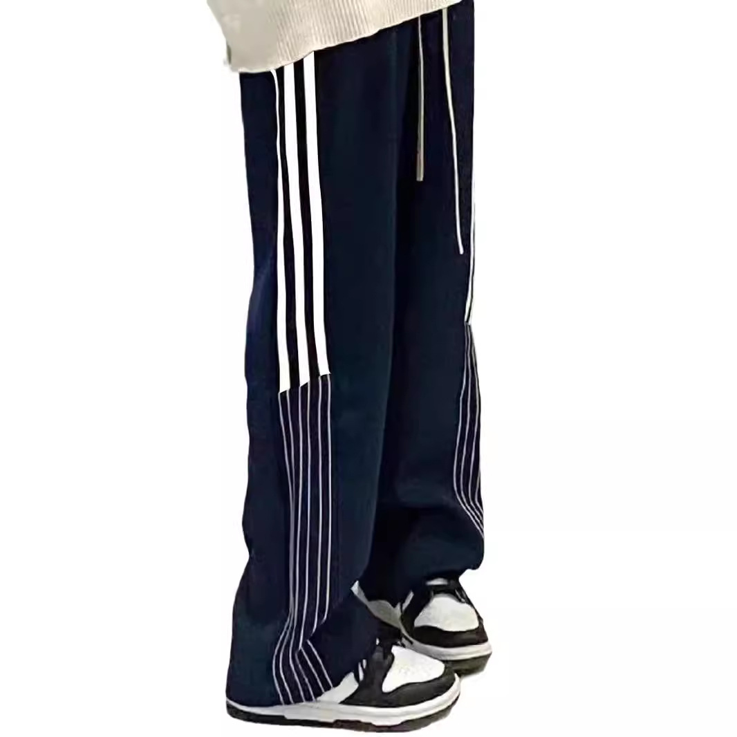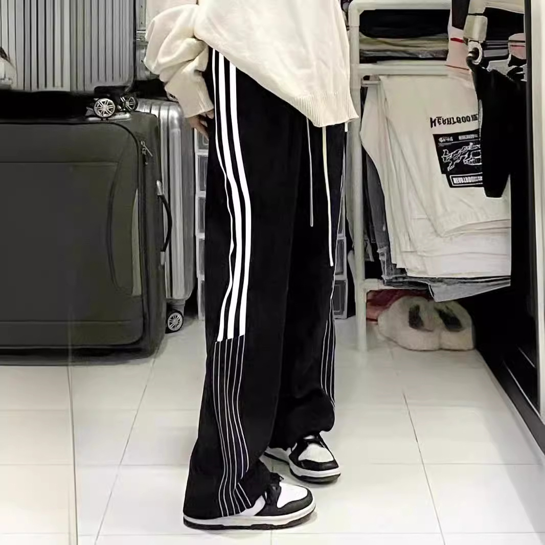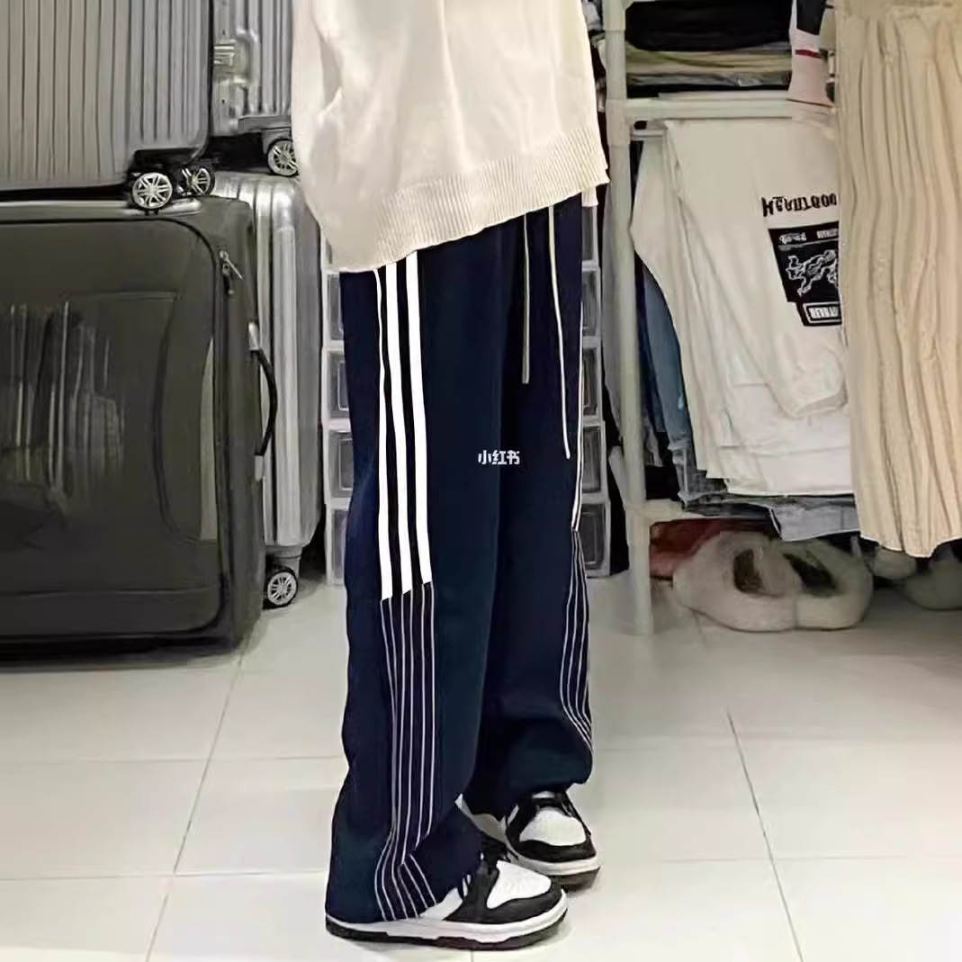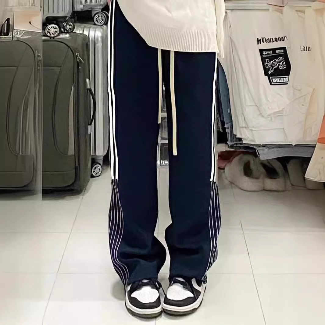 新款美式条纹运动裤女阔腿长裤子秋季韩版ins复古潮酷直筒休闲裤