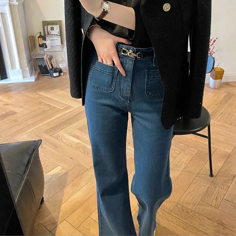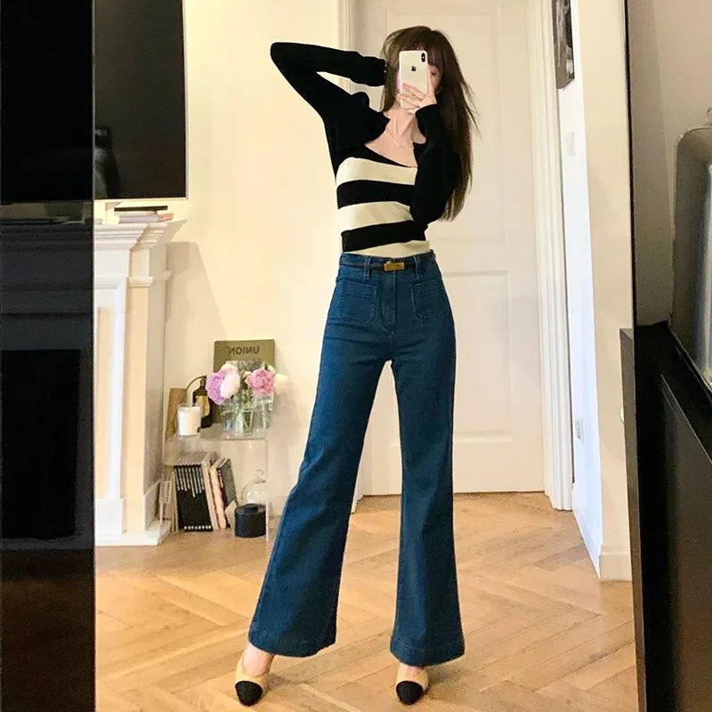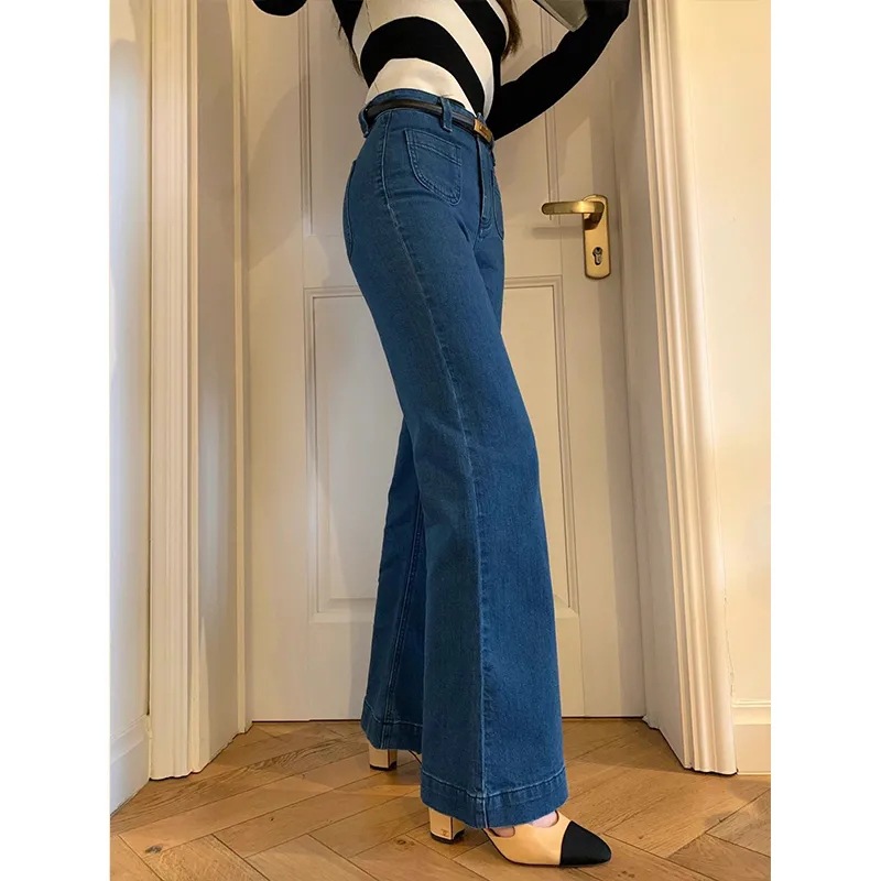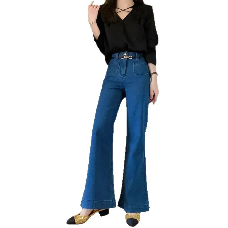 深蓝色微喇叭弹力牛仔阔腿裤女春秋新款复古高腰垂感显瘦拖地长裤