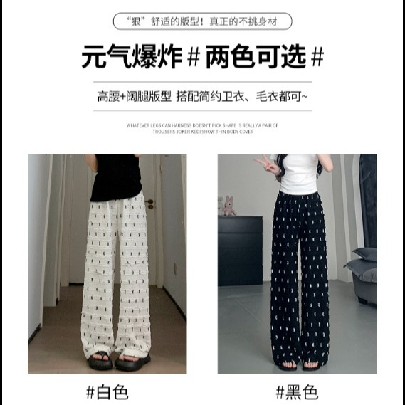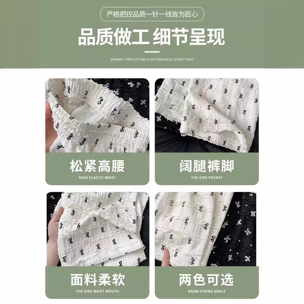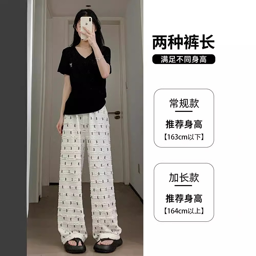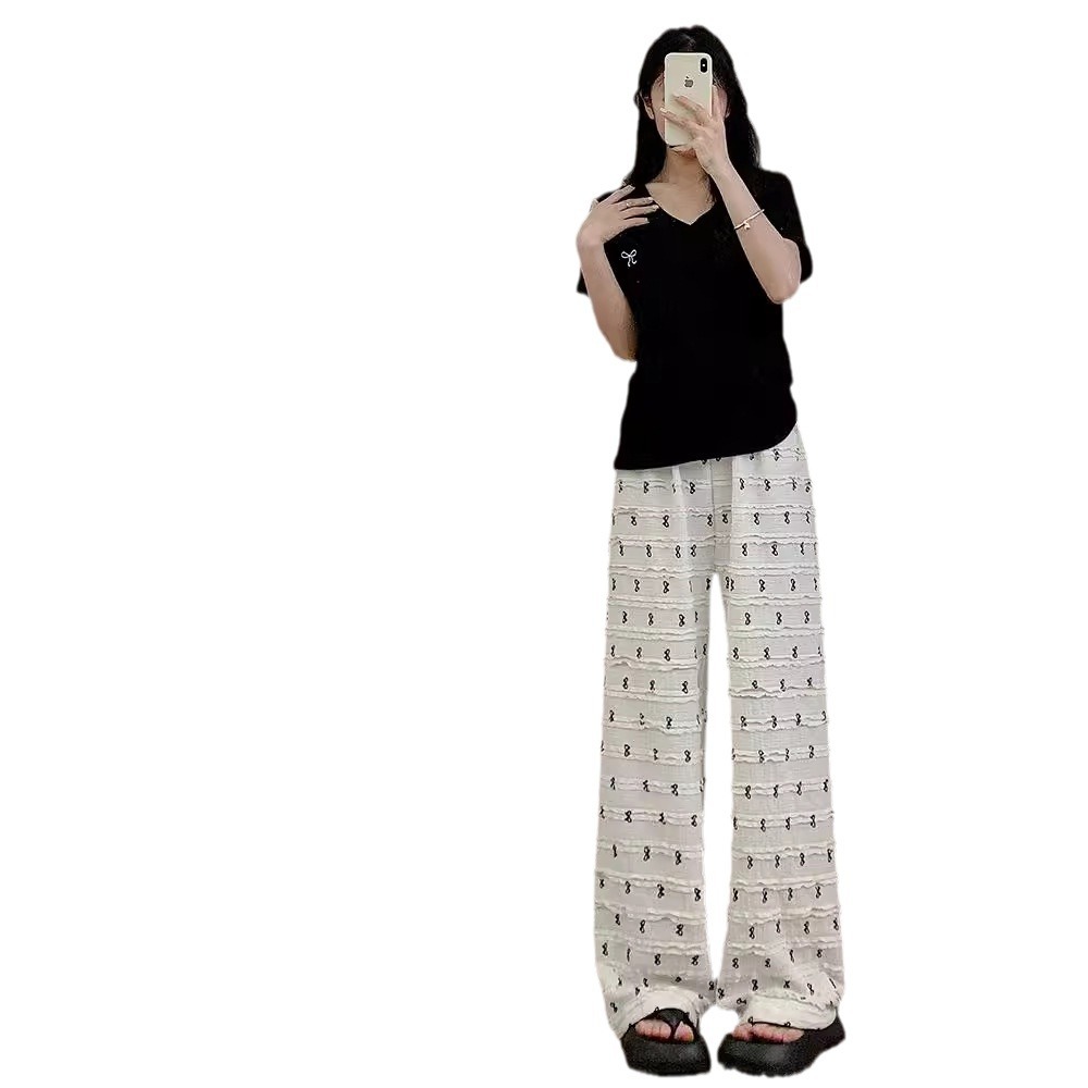 白色蝴蝶结阔腿裤女夏季冰丝高腰垂感休闲直筒显瘦蕾丝慵懒条纹裤