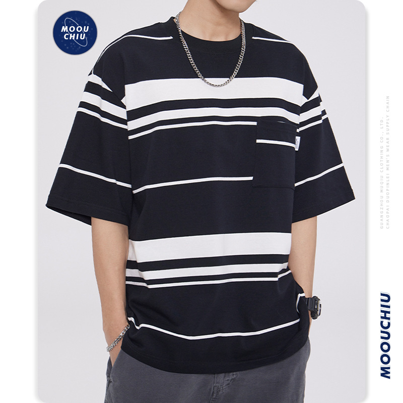 310G重磅黑白条纹T恤男士ins宽松美式宽松情侣短袖上衣