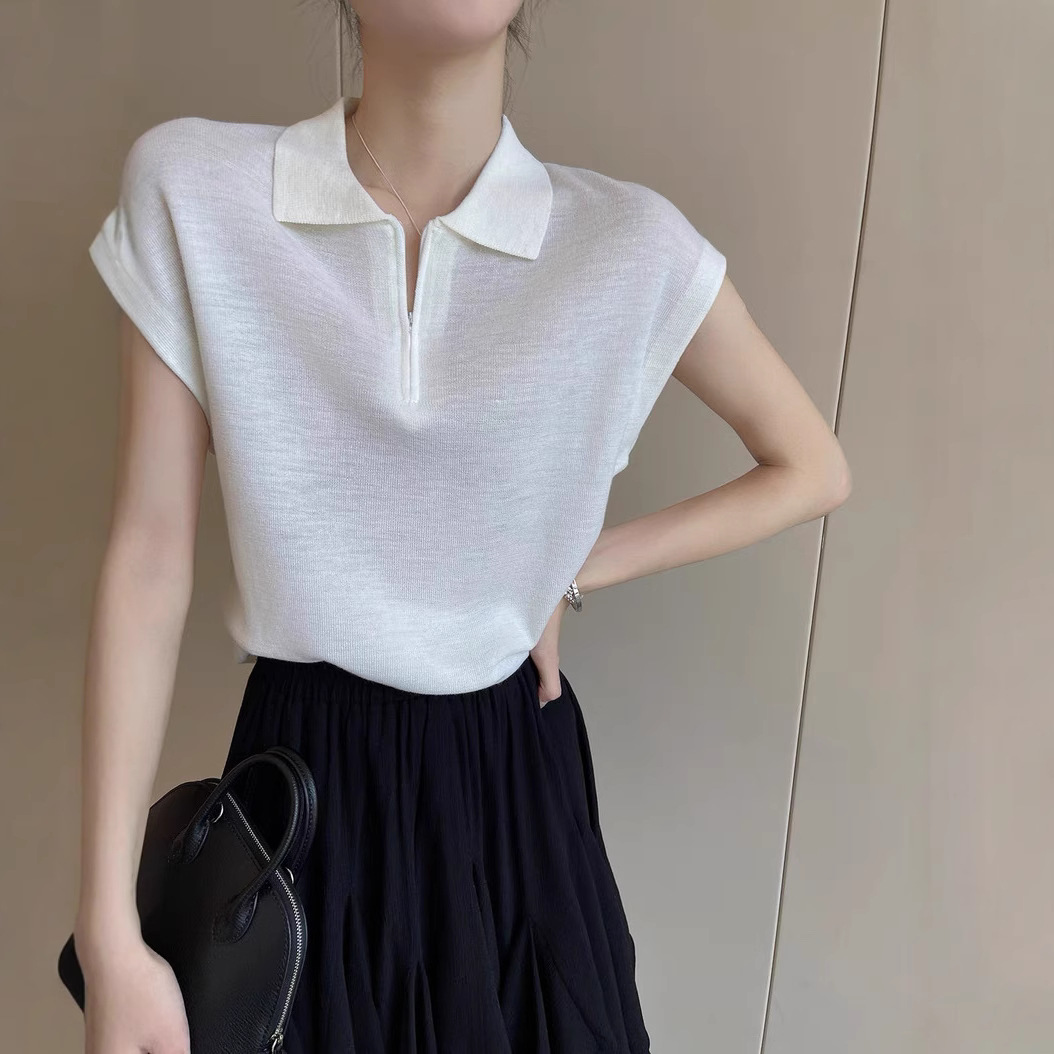 白色polo领针织短袖T恤女夏季2025新气质减龄清爽老钱上衣
