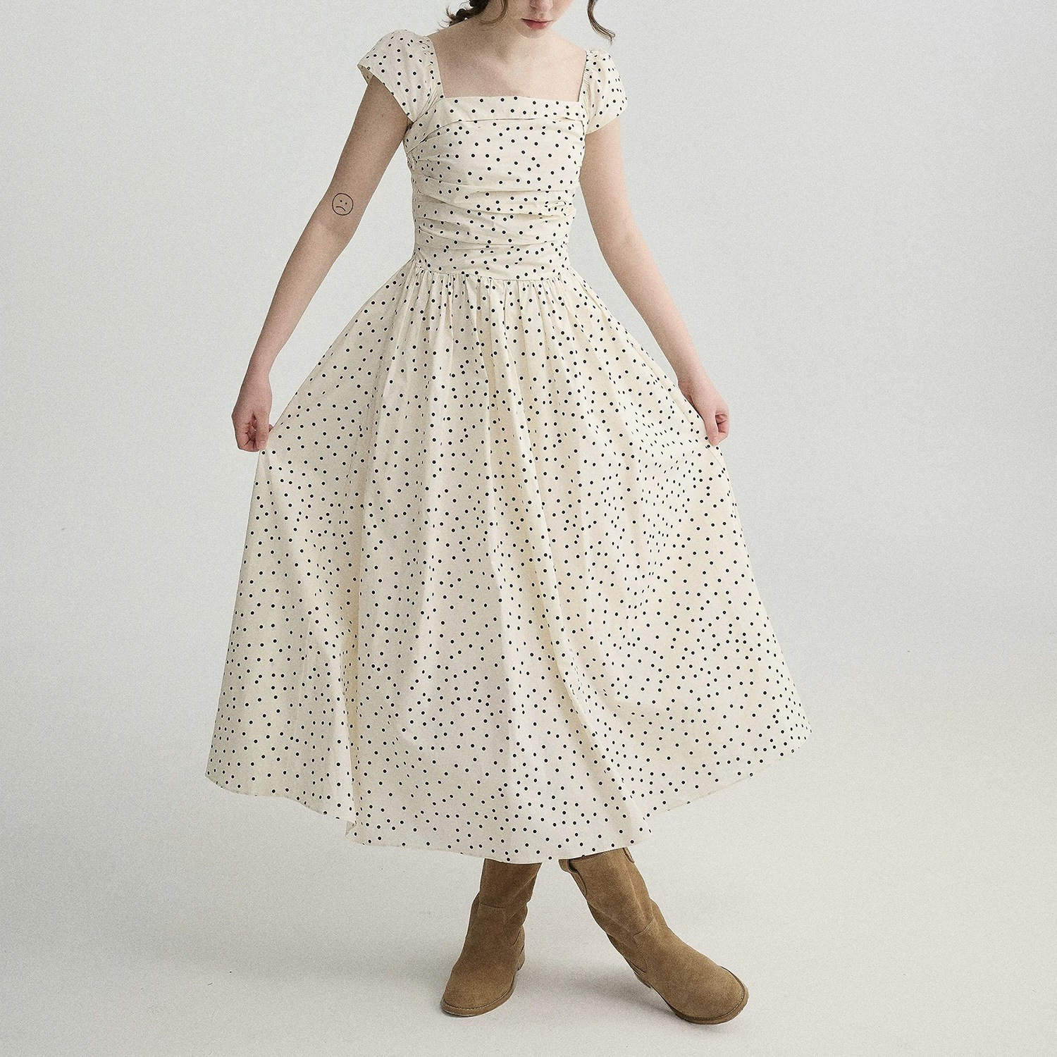波西米亚' 杏色波点打揽收腰小飞袖中长款连衣裙新款女装