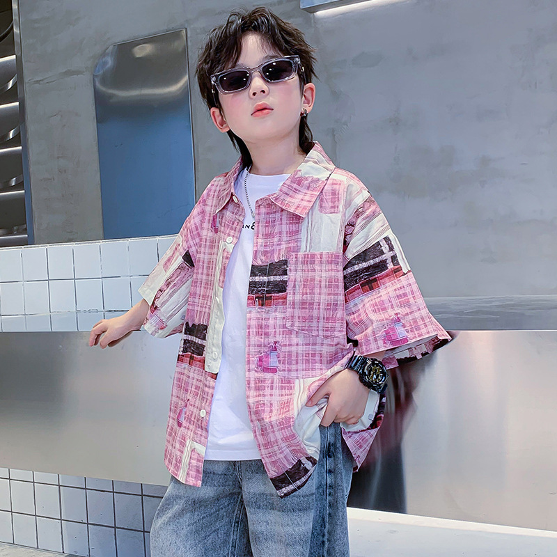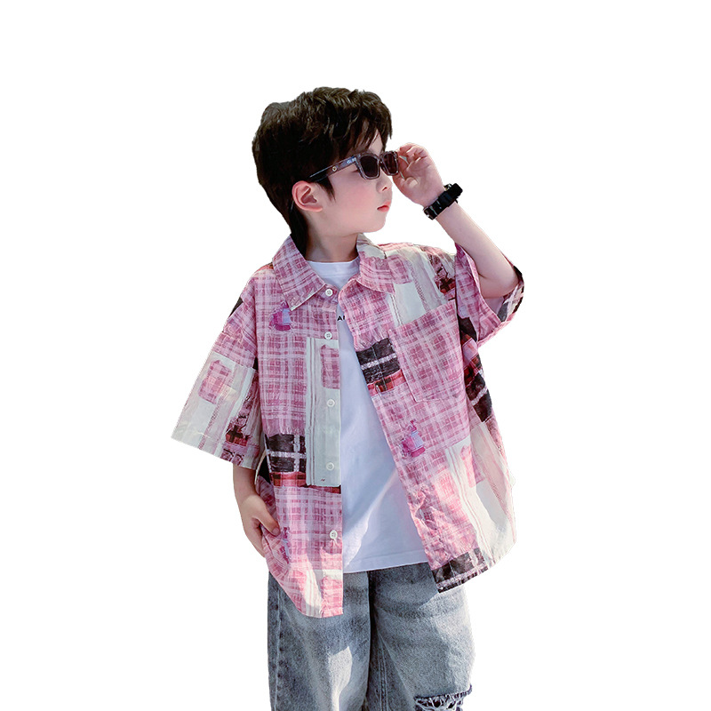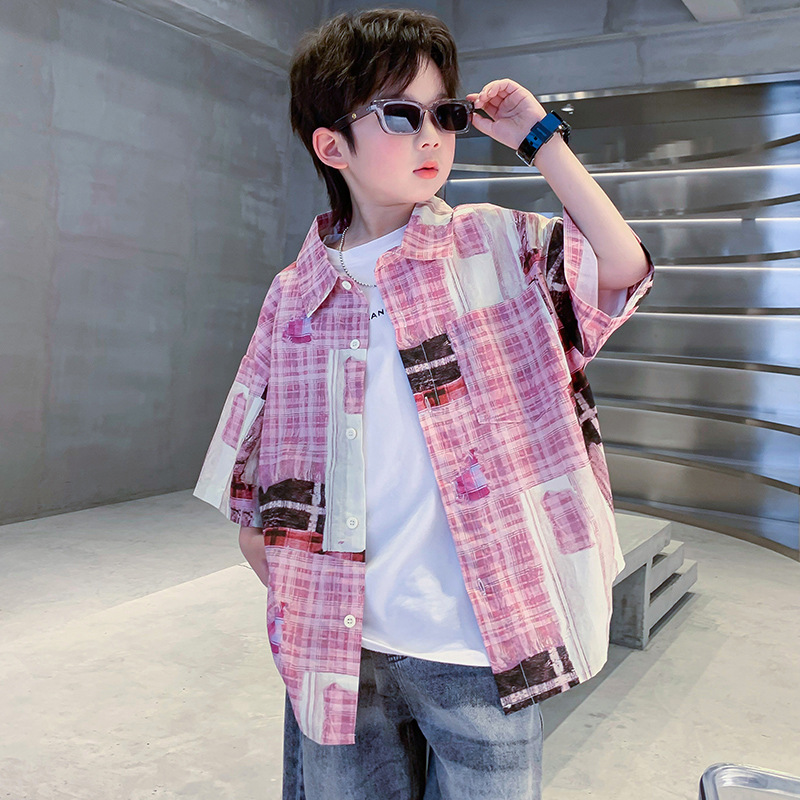 儿童装男童夏装短袖衬衫外套夏季薄2025新款中大童夏款花格子衬衣