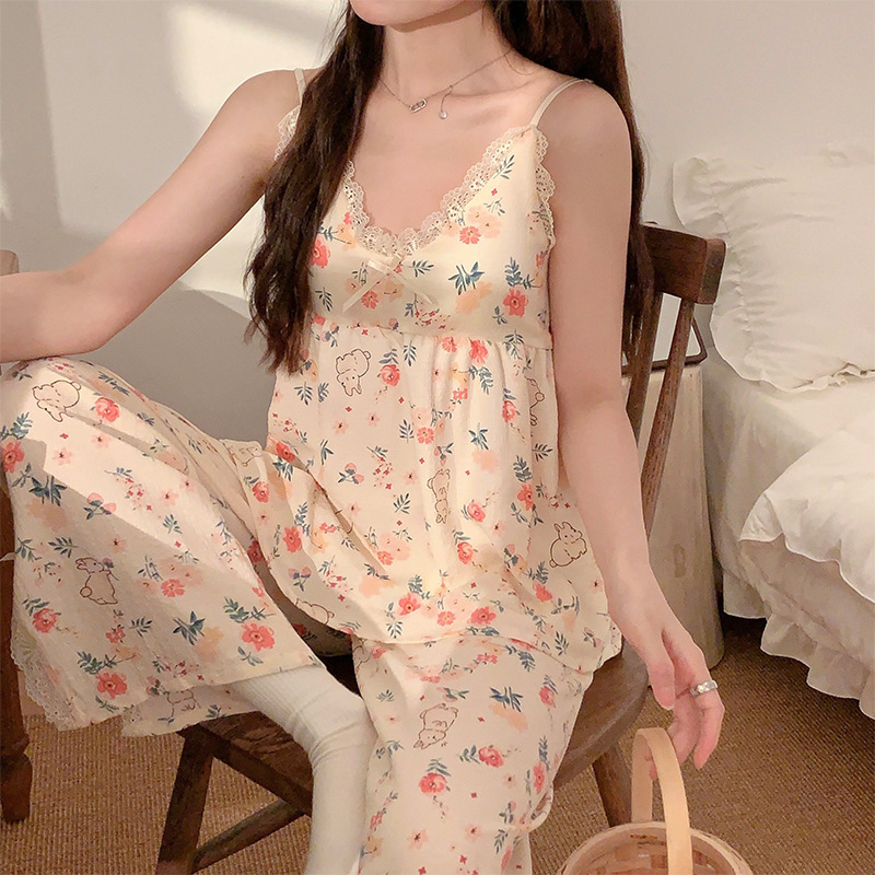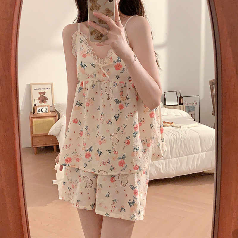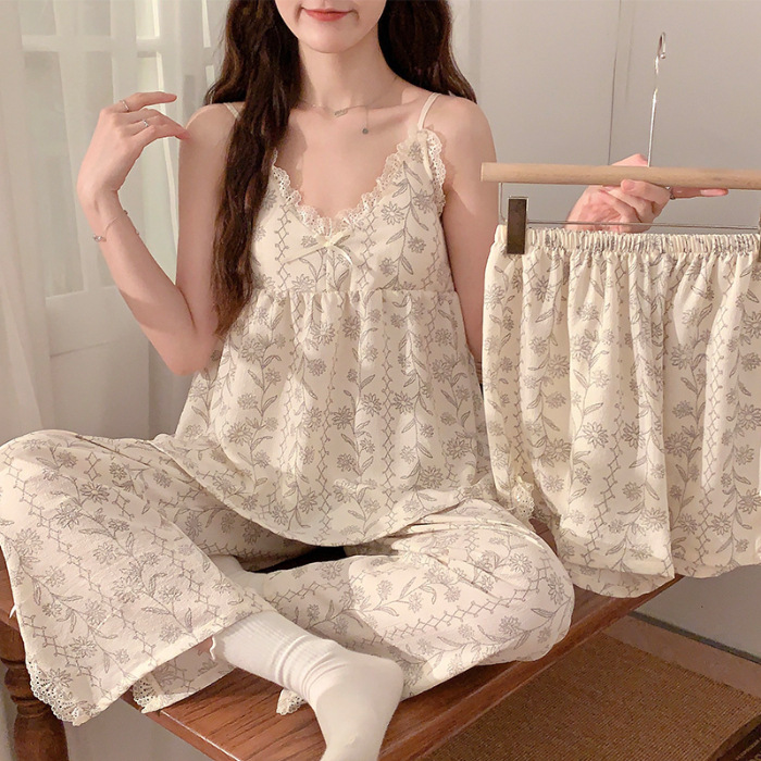 吊带三件套带可拆胸垫梭织泡泡皱布小碎花吊带睡衣女春夏睡衣套装