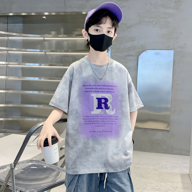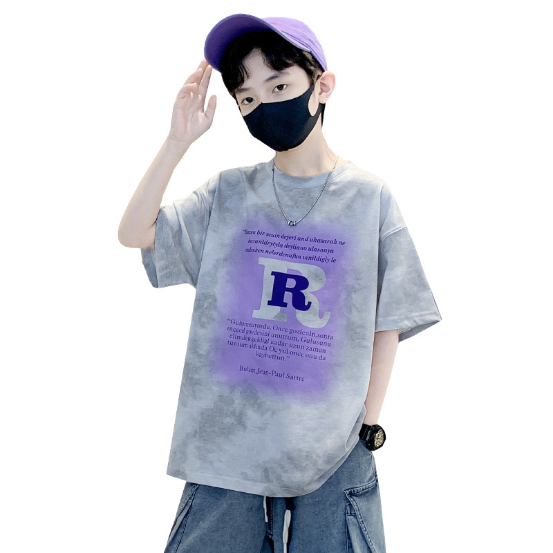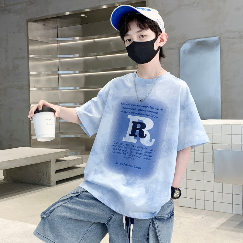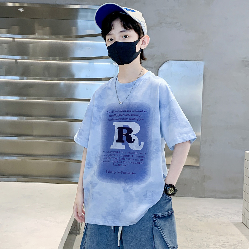 男童字母印花扎染T恤夏季薄t2025新款儿童潮服青少年学生圆领短袖