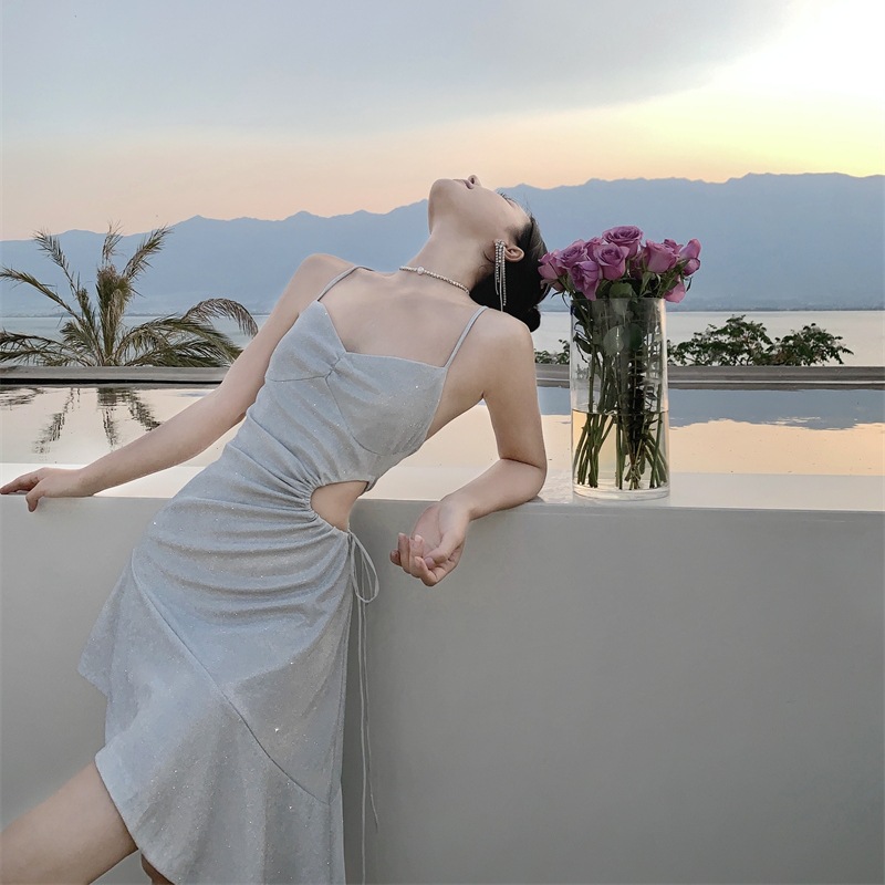 夏季性感纯欲风光泽感亮片露背镂空抽绳不规则连衣裙短裙女