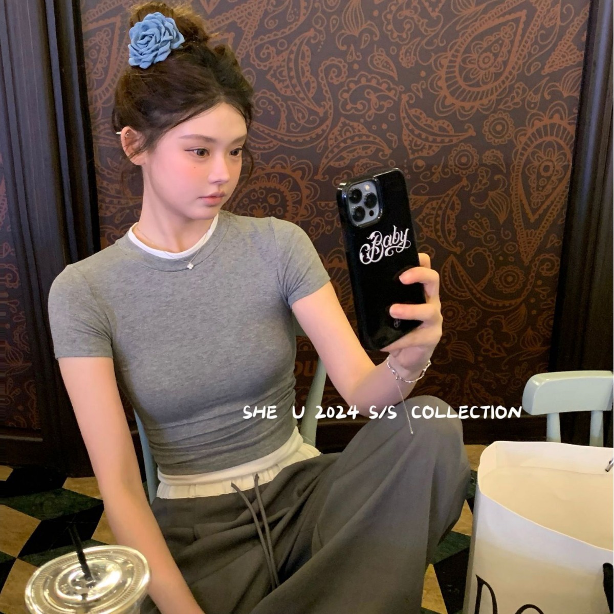 设计感撞色抽褶T恤女春夏修身显瘦百搭圆领上衣