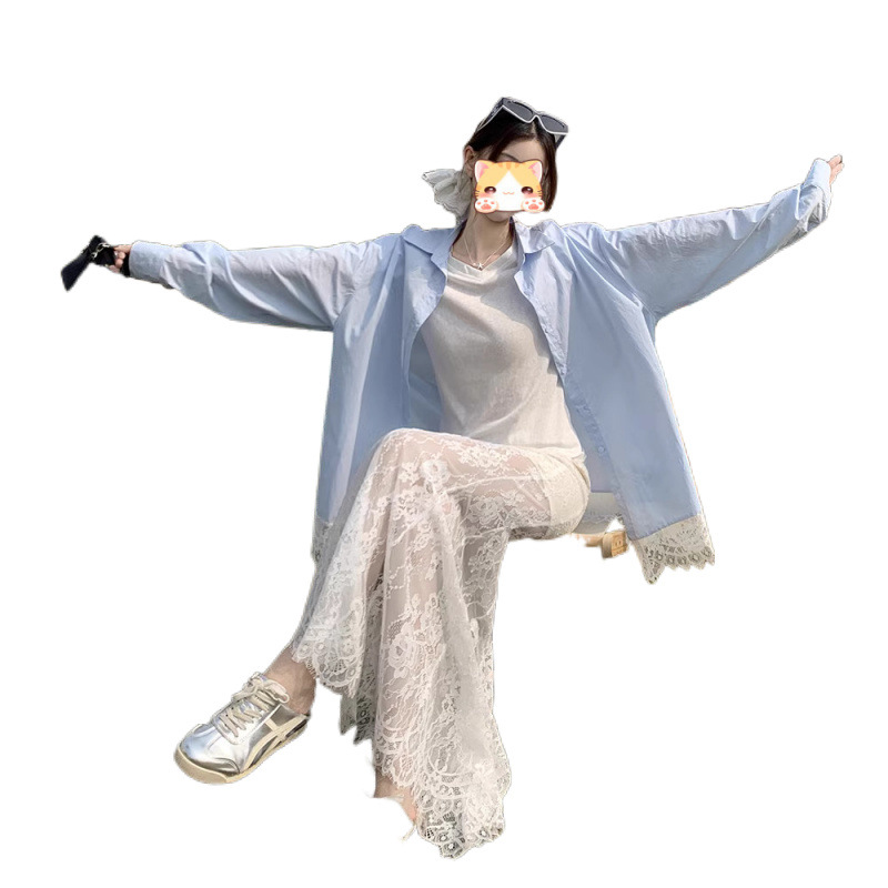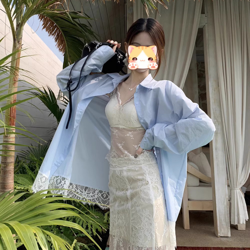 蕾丝拼接宽松长袖衬衫女2025春夏新款polo领设计感度假风防晒上衣