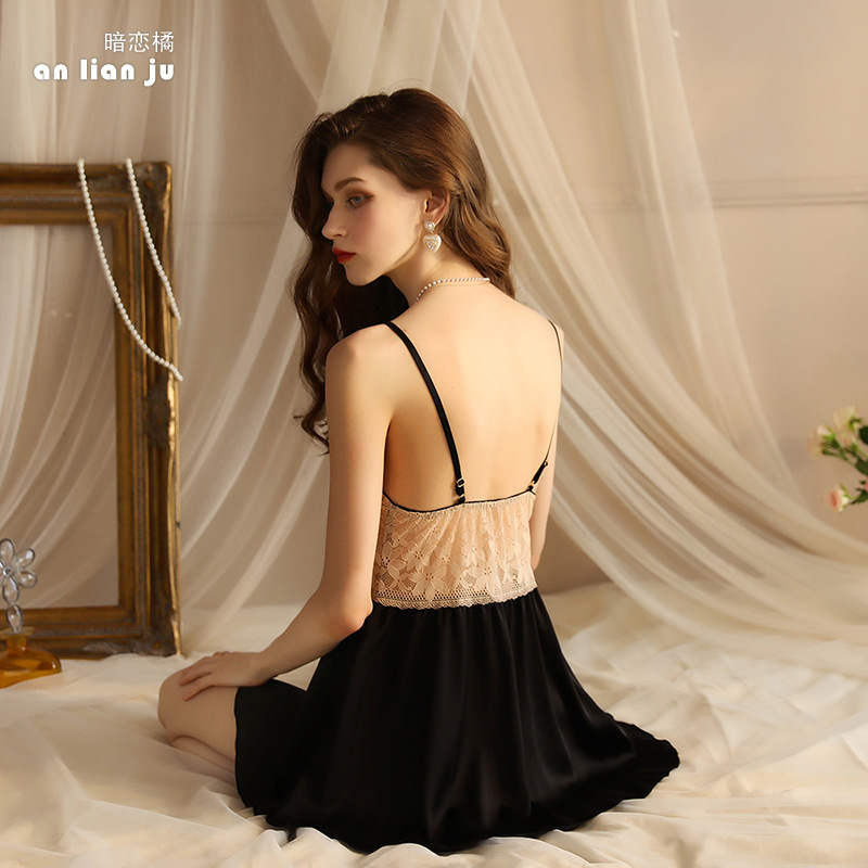 菲韵夏秋季新款性感深V蕾丝缎面透视吊带裙睡裙女士家居服