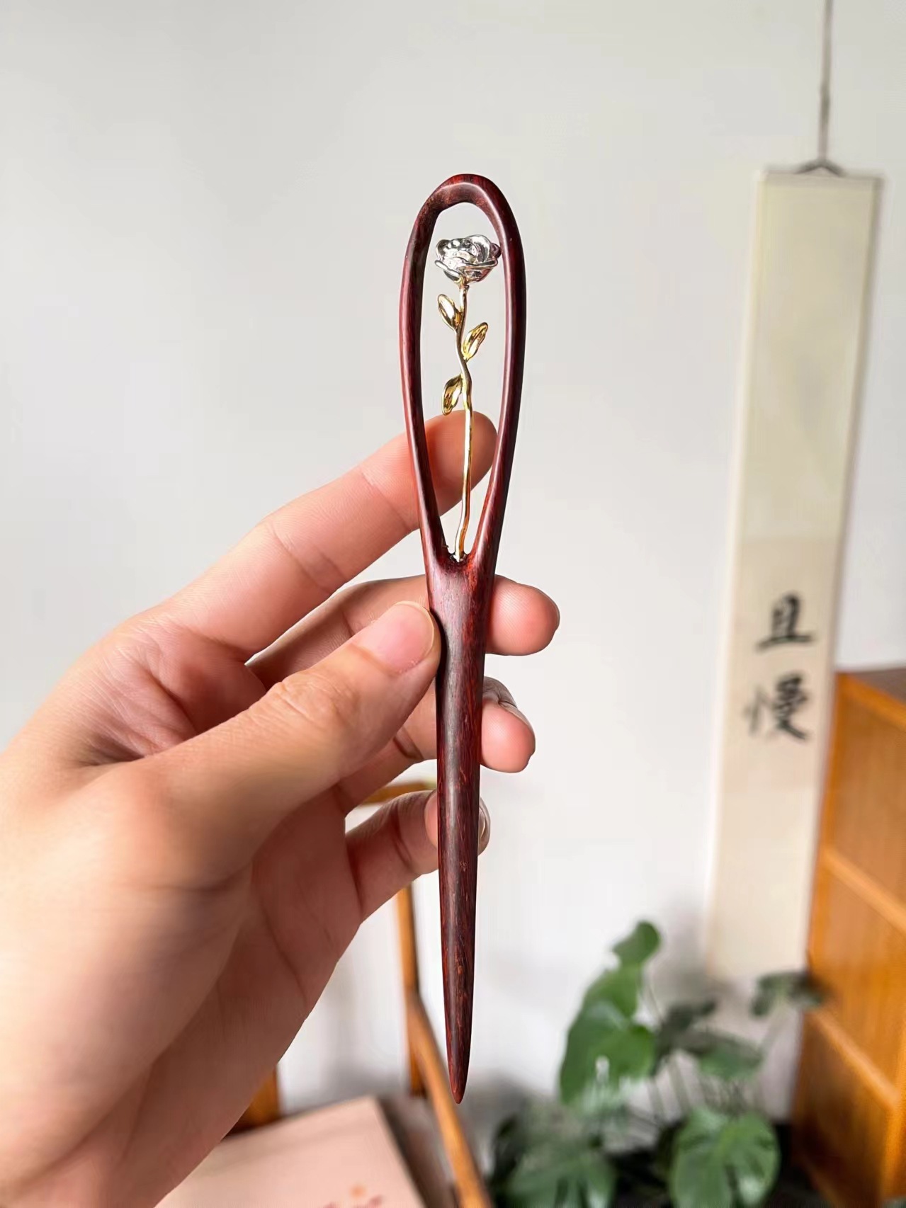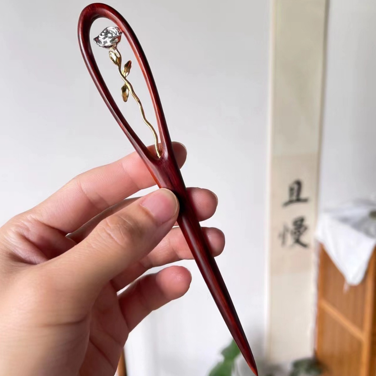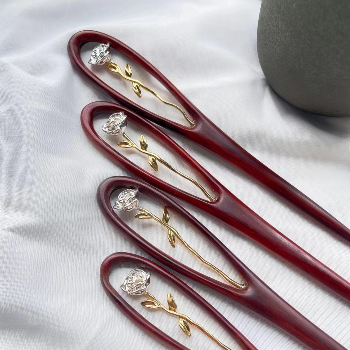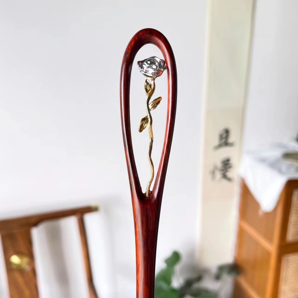玫瑰空镜花 檀木发簪一只