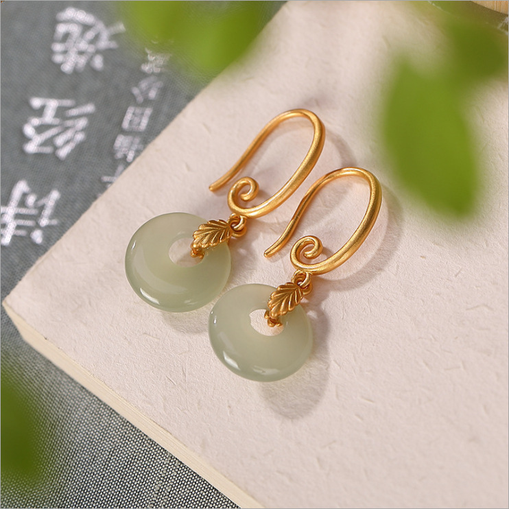 新中式和田耳环女s925纯银葫芦平安扣耳复古宫廷风玉石耳环