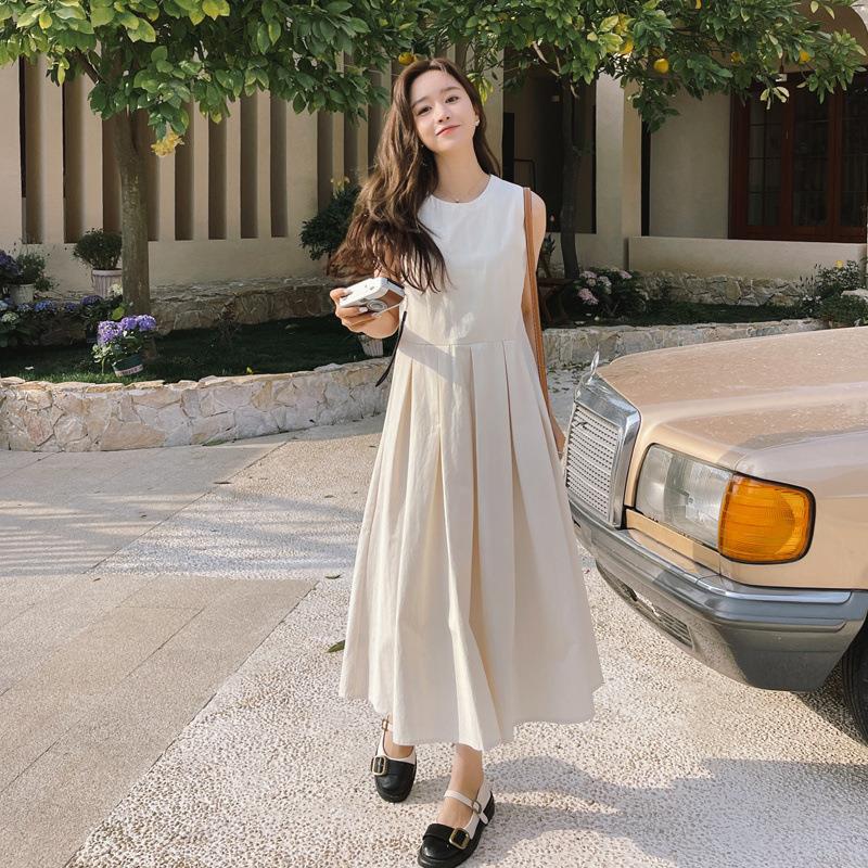 实拍法式小圆领无袖背心裙高腰拼接压褶大裙摆轻文艺米白色连衣裙