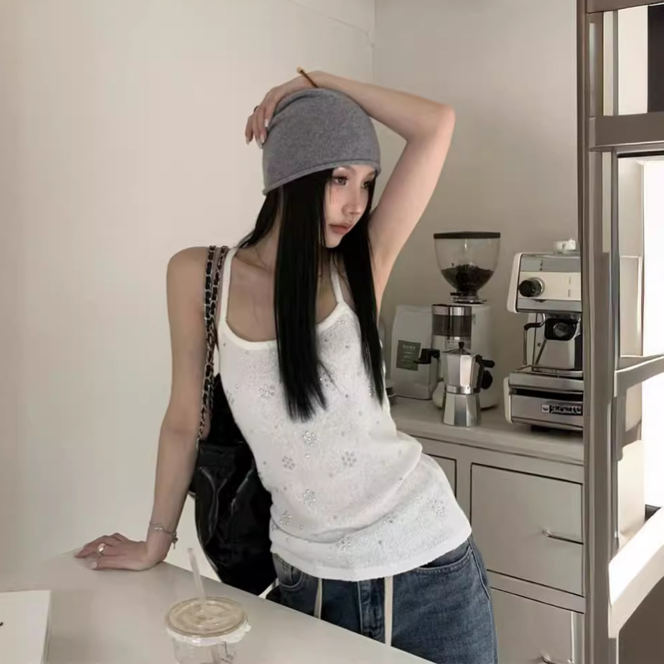 白色烫钻修身针织小吊带女夏季显瘦内搭辣妹无袖背心露背上衣外穿