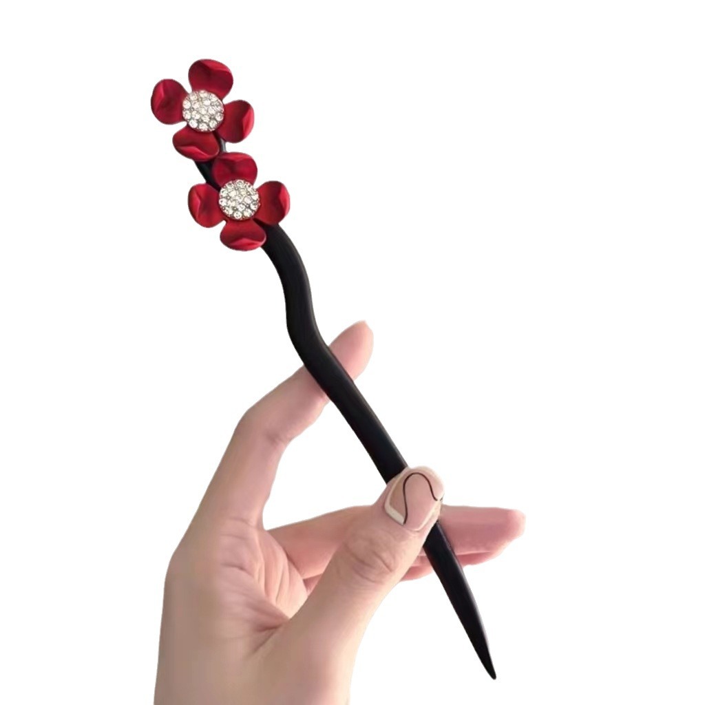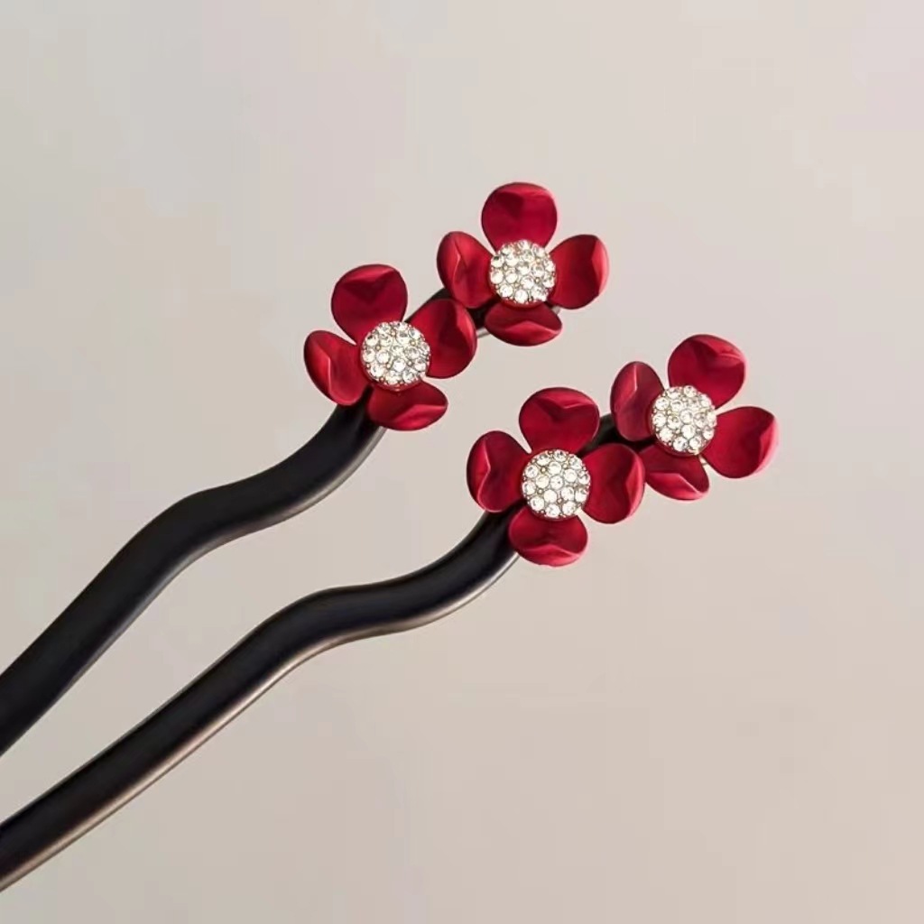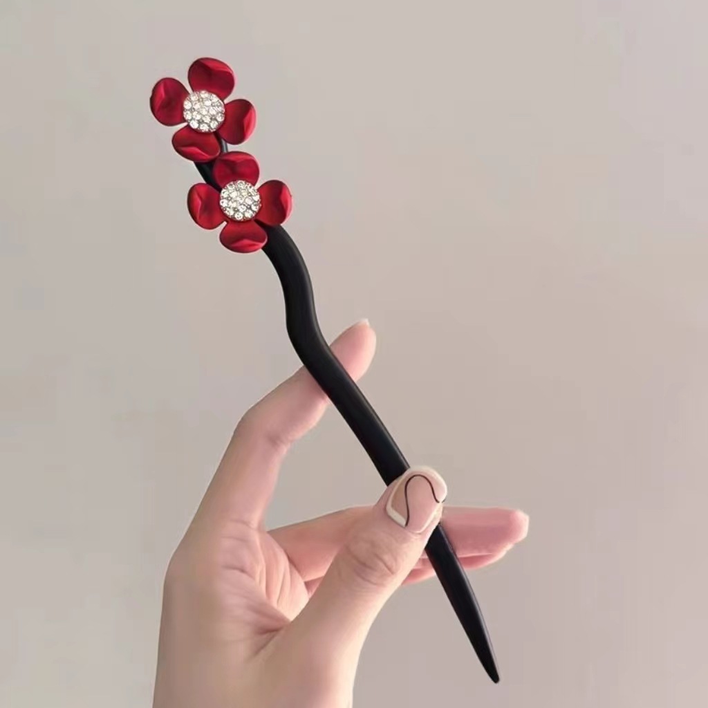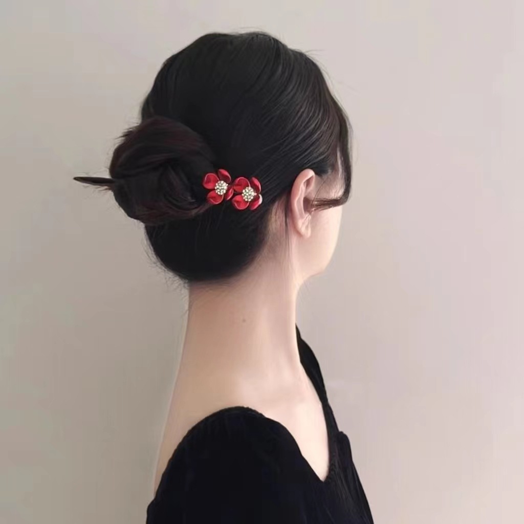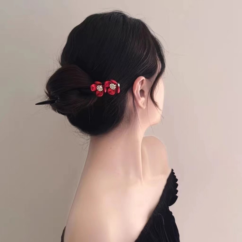 山茶有爱意 新中式复古黑檀木红色花朵发簪子 高级精致现代盘发钗