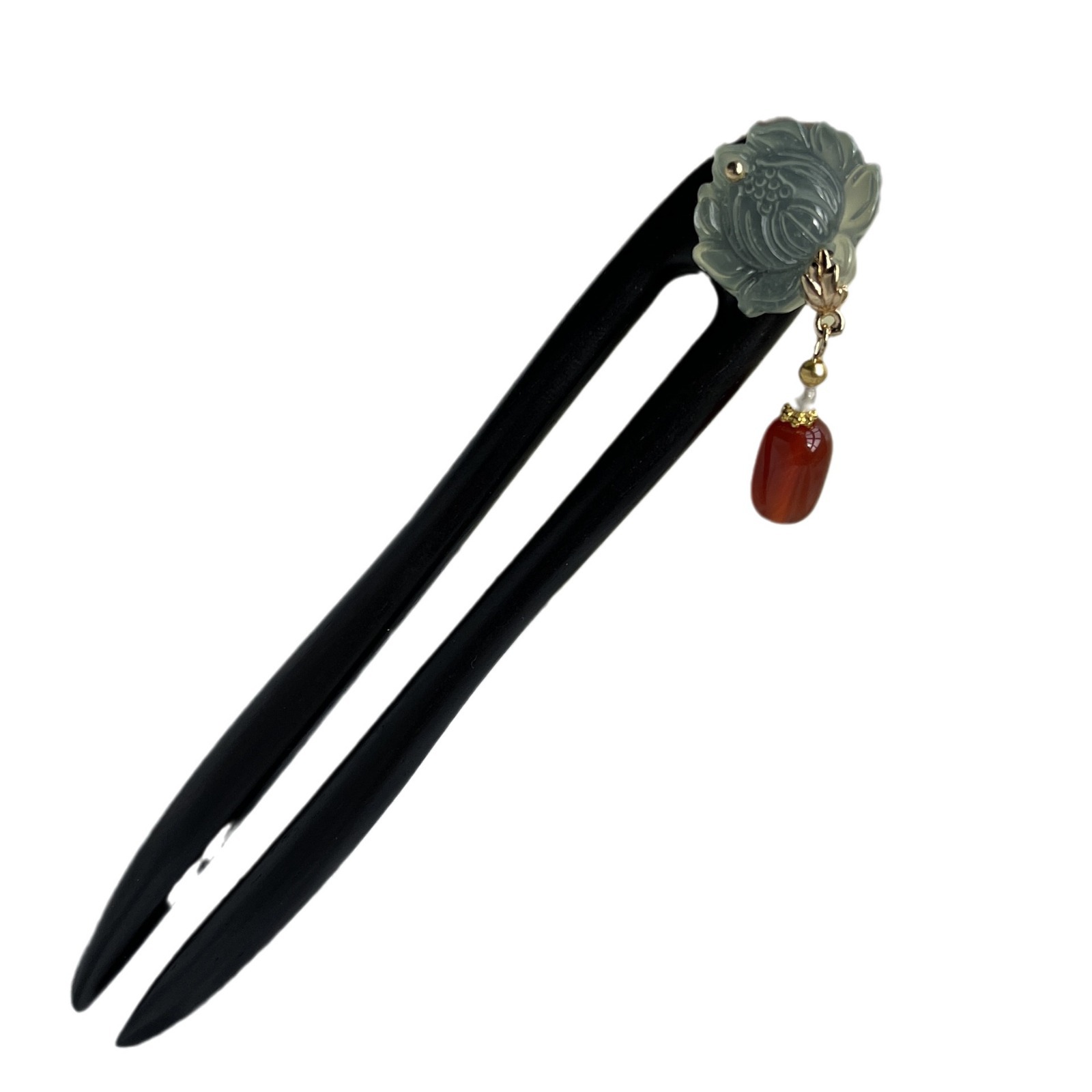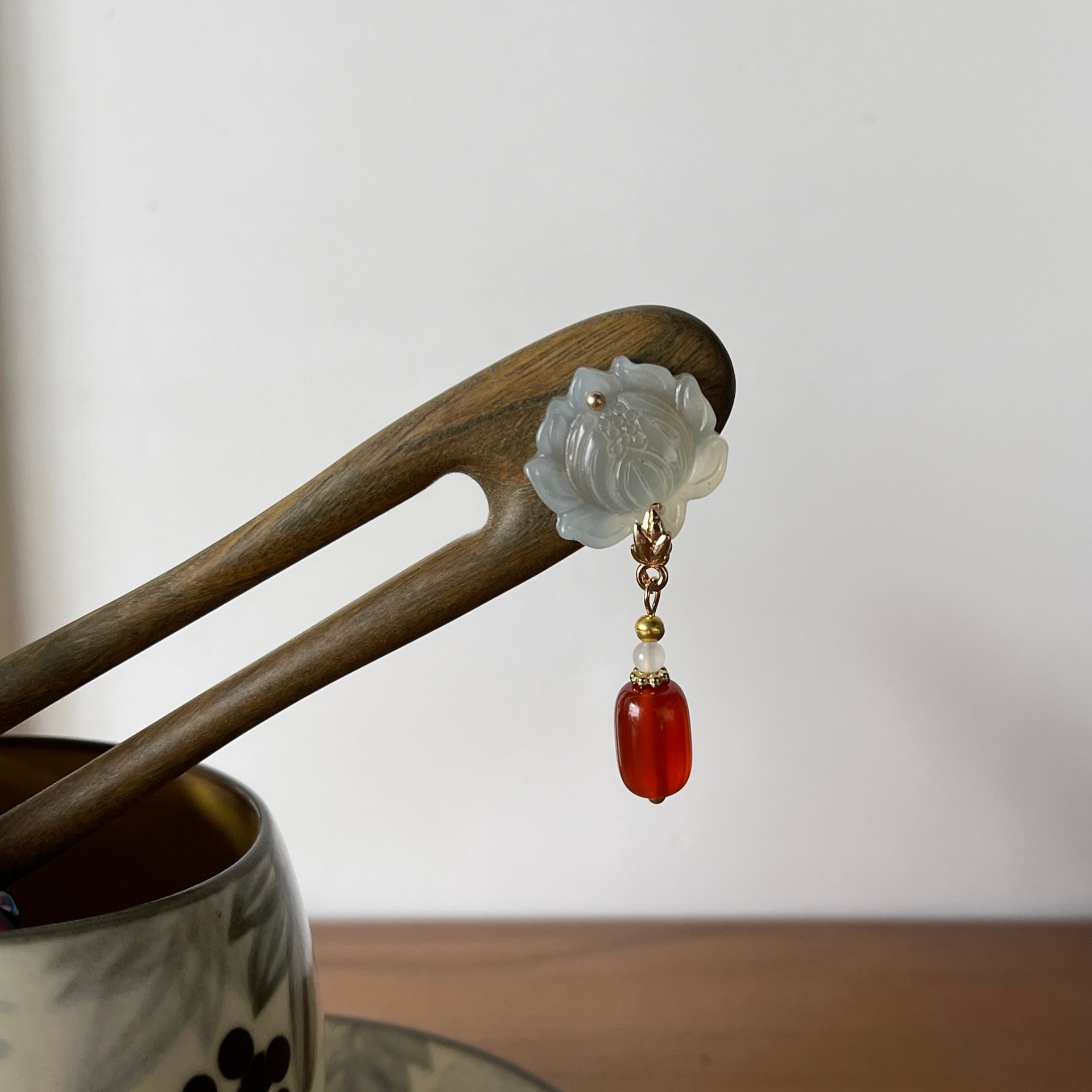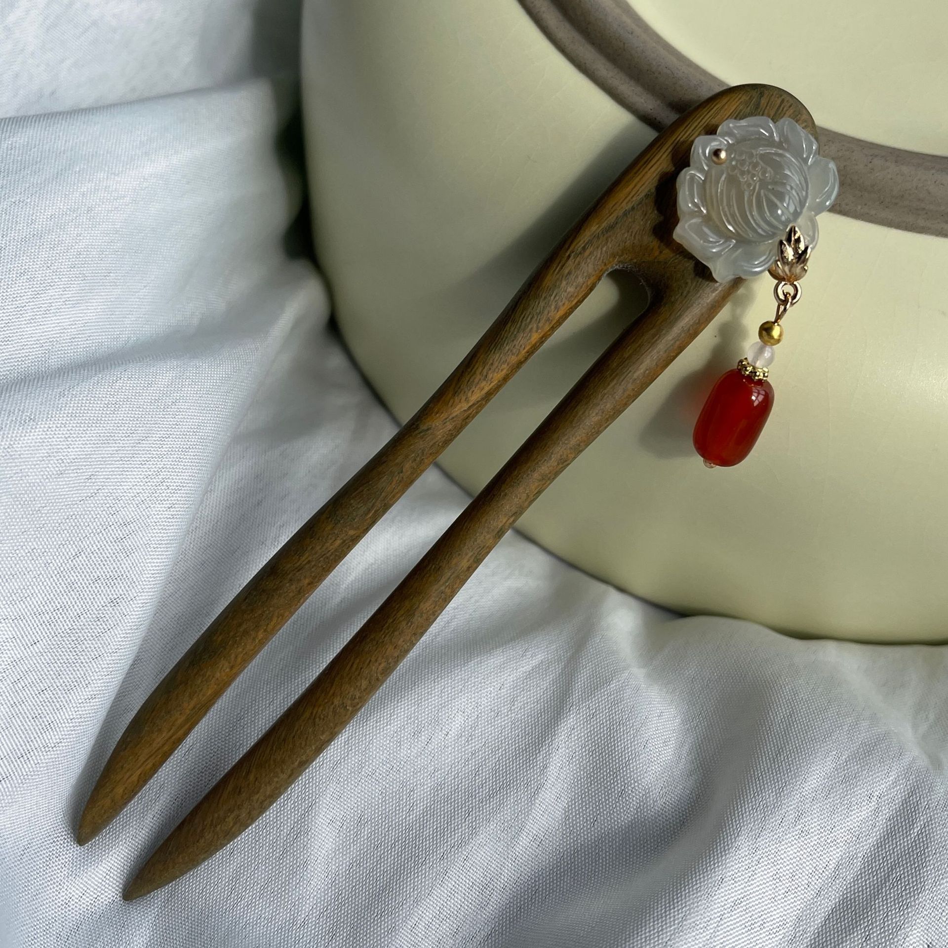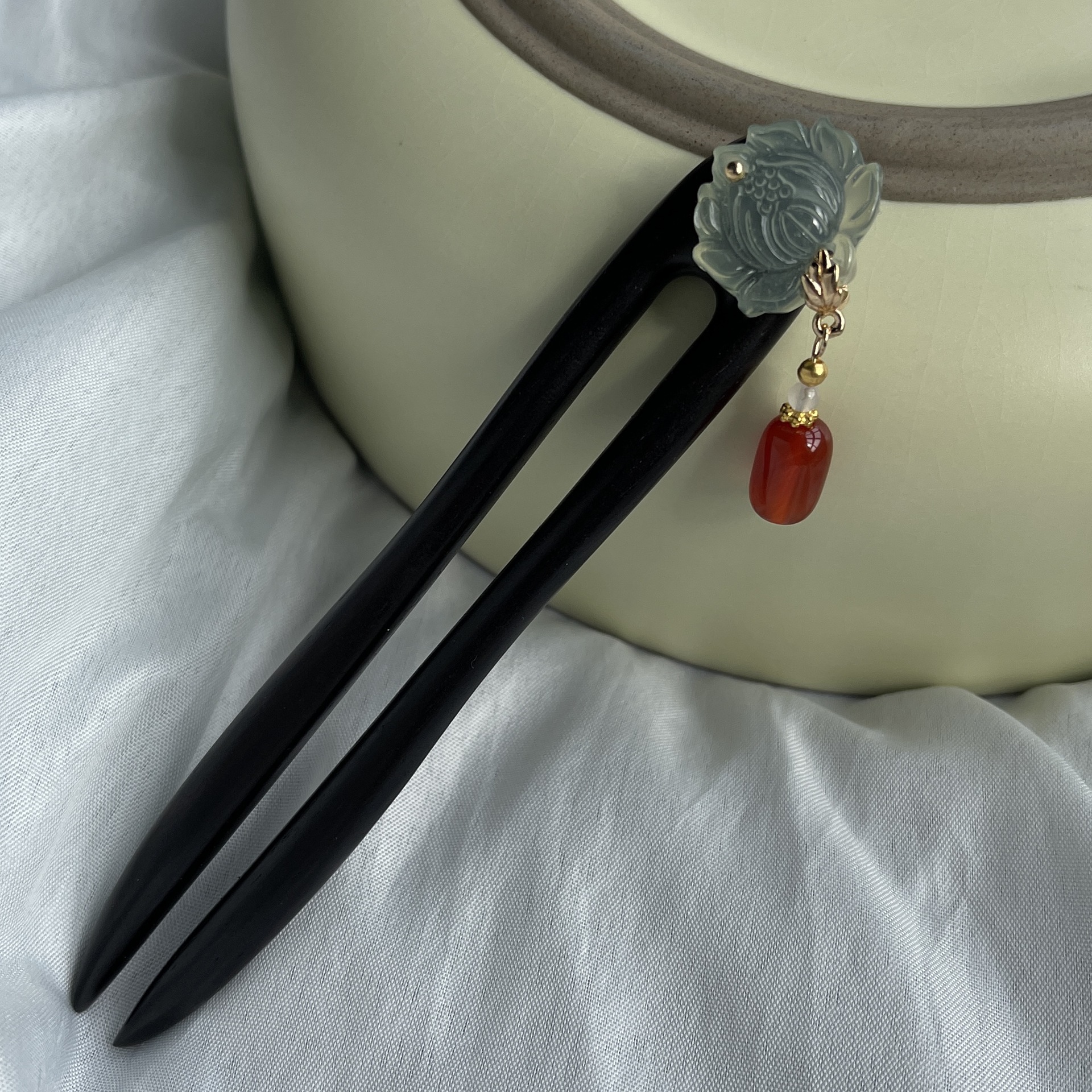 【不负韶华】绿檀木发簪短款U型日常盘发简约发钗岫玉莲花流苏女