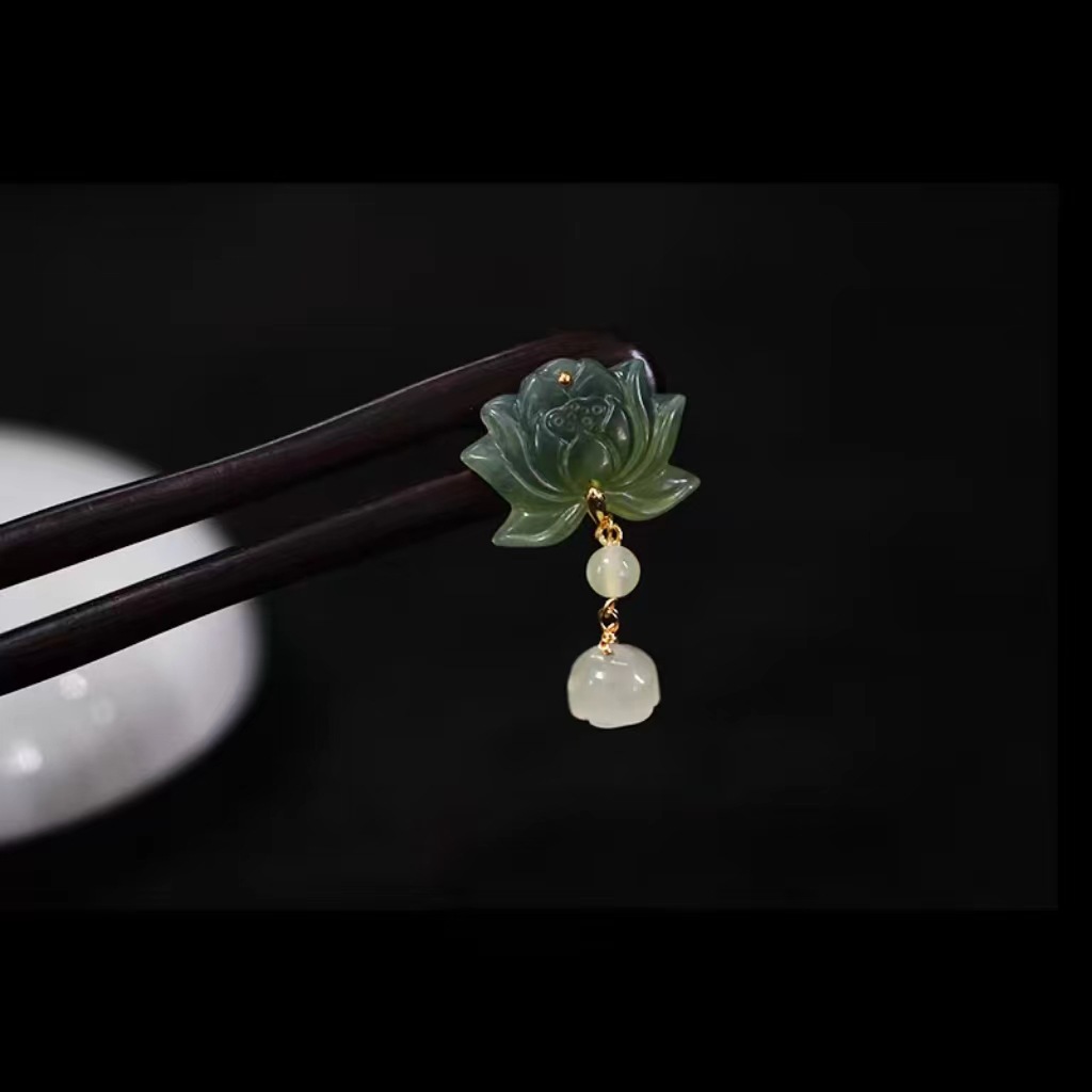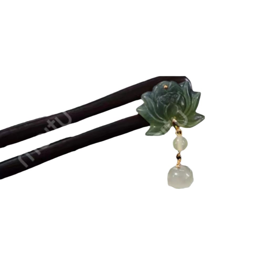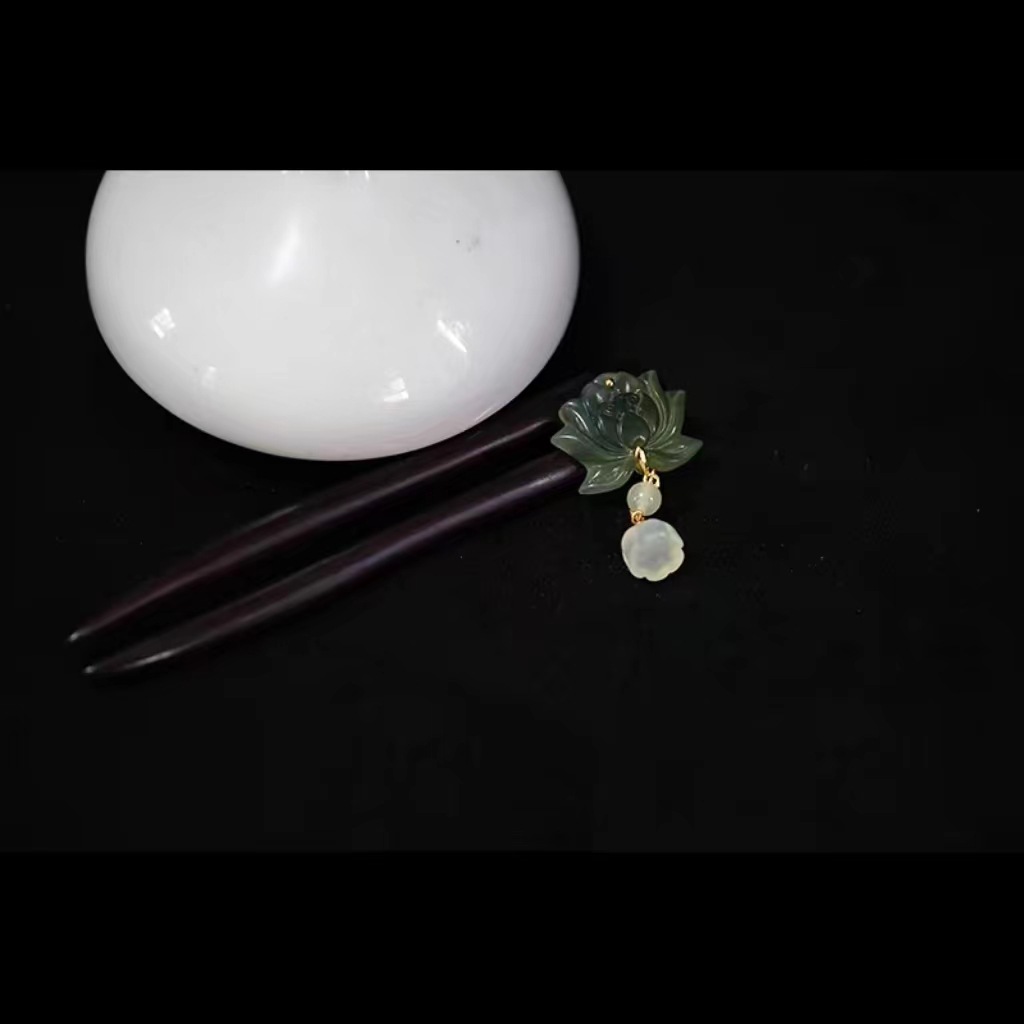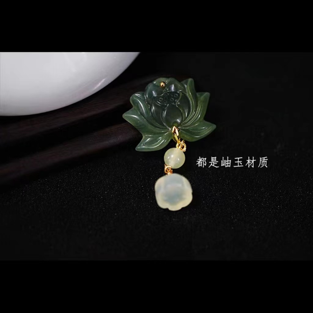 新中式原创双叉簪u型双钗木簪岫玉荷花莲蓬高级感茶服旗袍配饰女