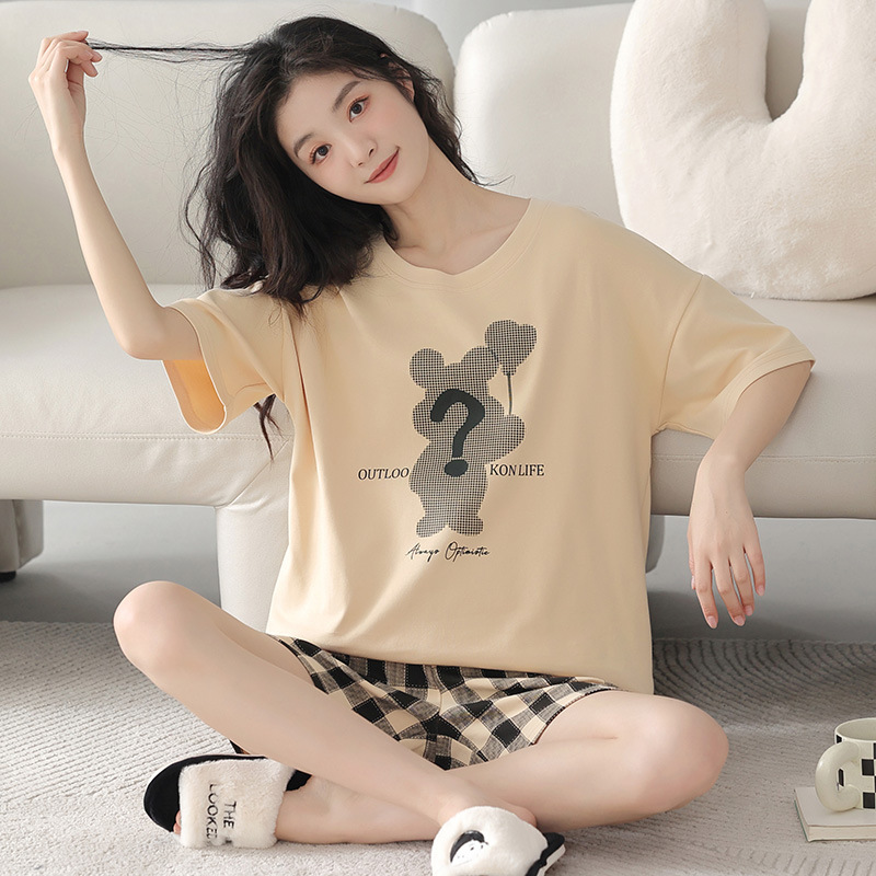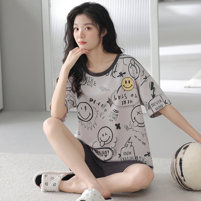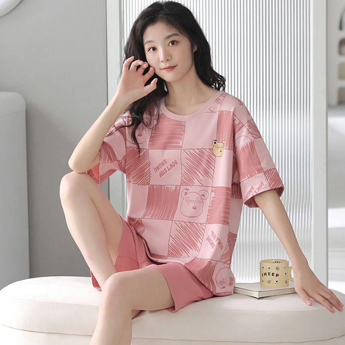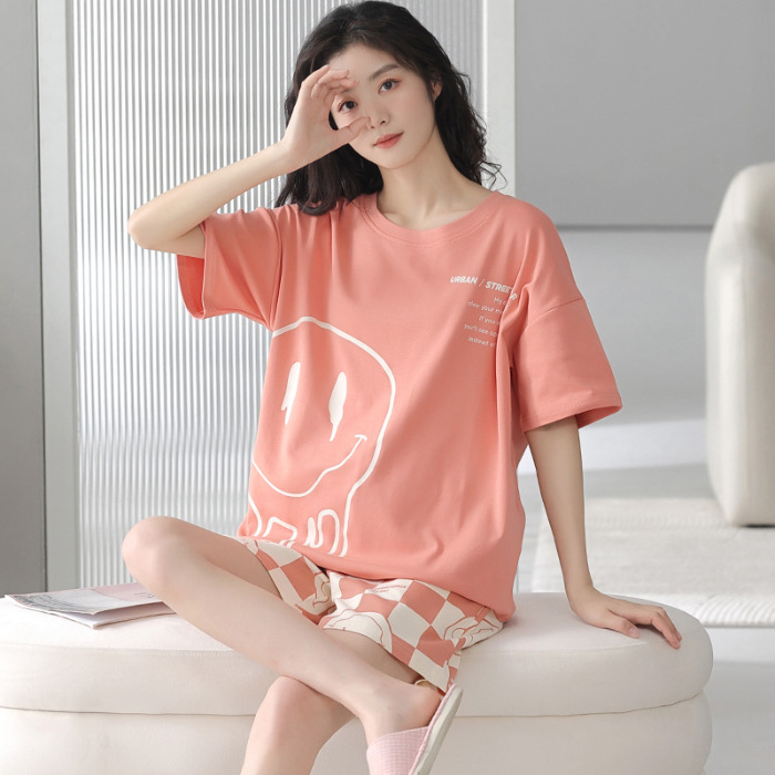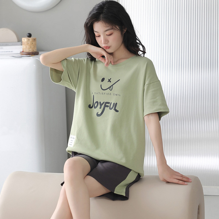 夏季纯棉薄款睡衣女圆领套头短裤短袖甜美可爱风家居服套装