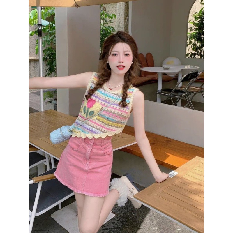 高品质多巴胺穿搭彩色条纹针织背心女夏季甜美风设计感不规则无袖