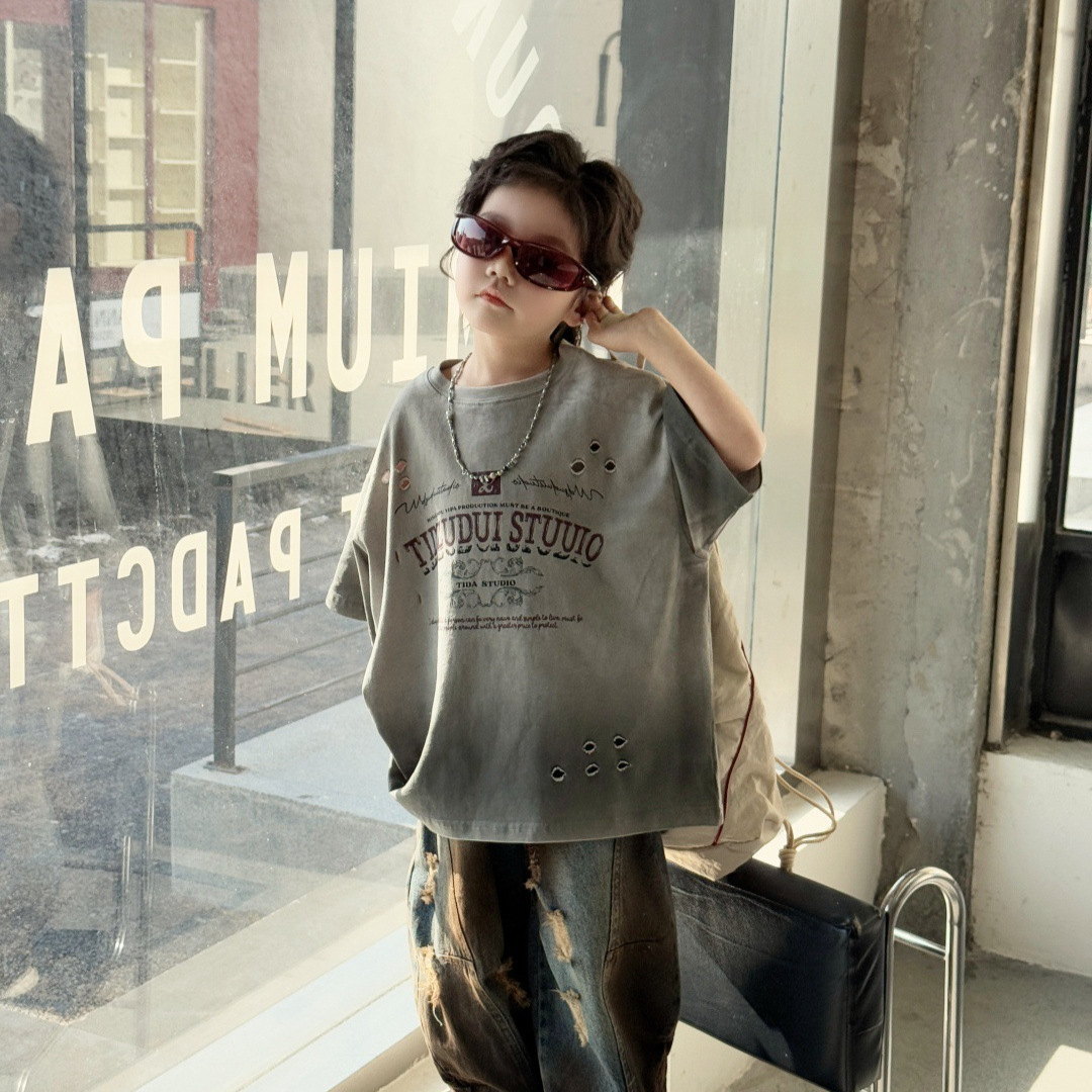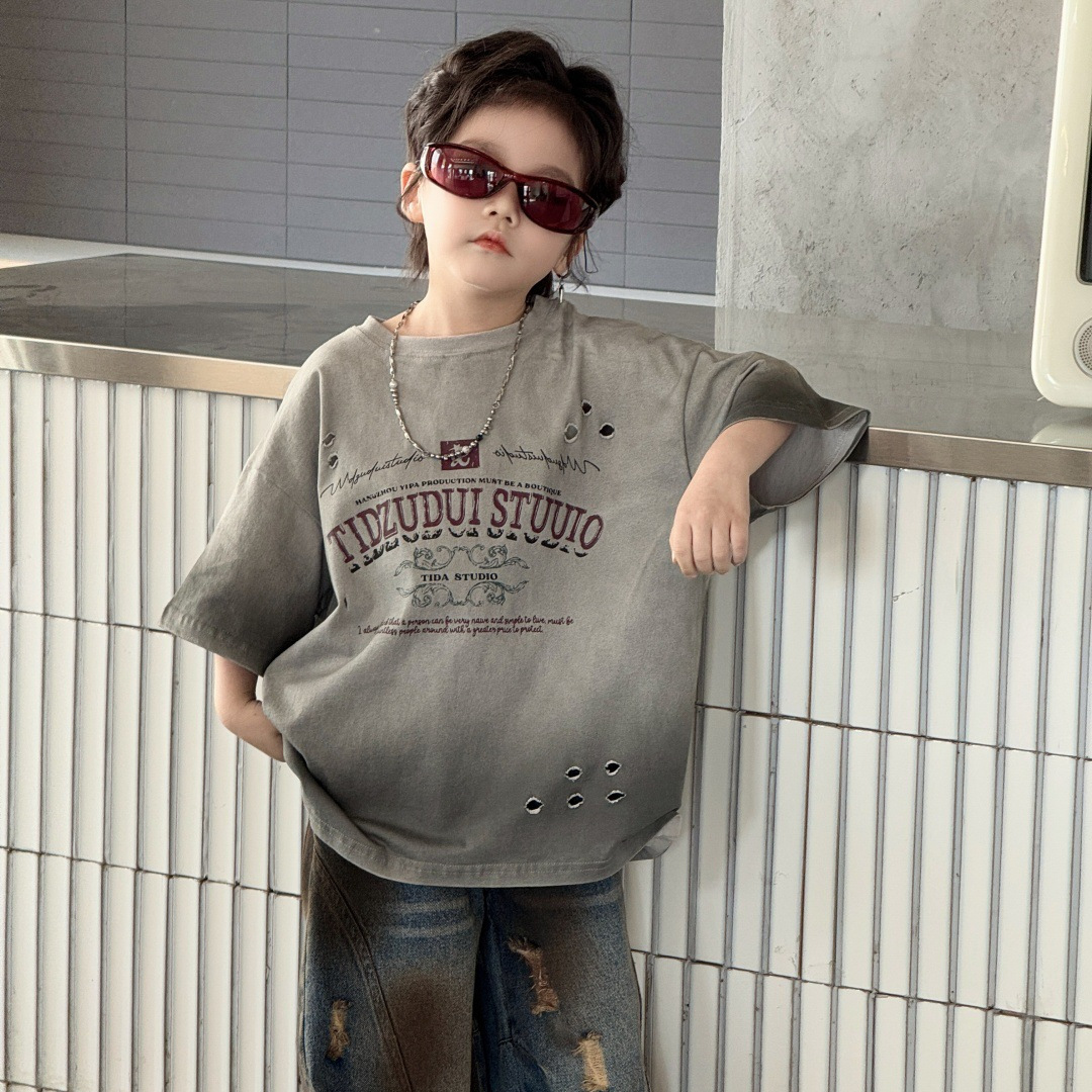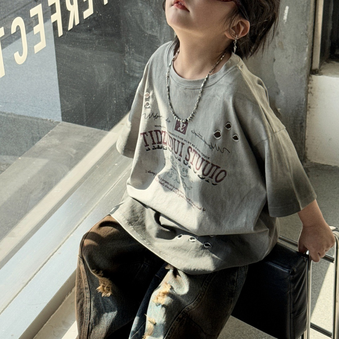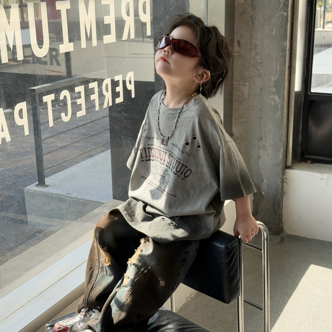 童装儿童T恤男童短袖喷染破洞美式复古上衣2025年夏季洋气男宝