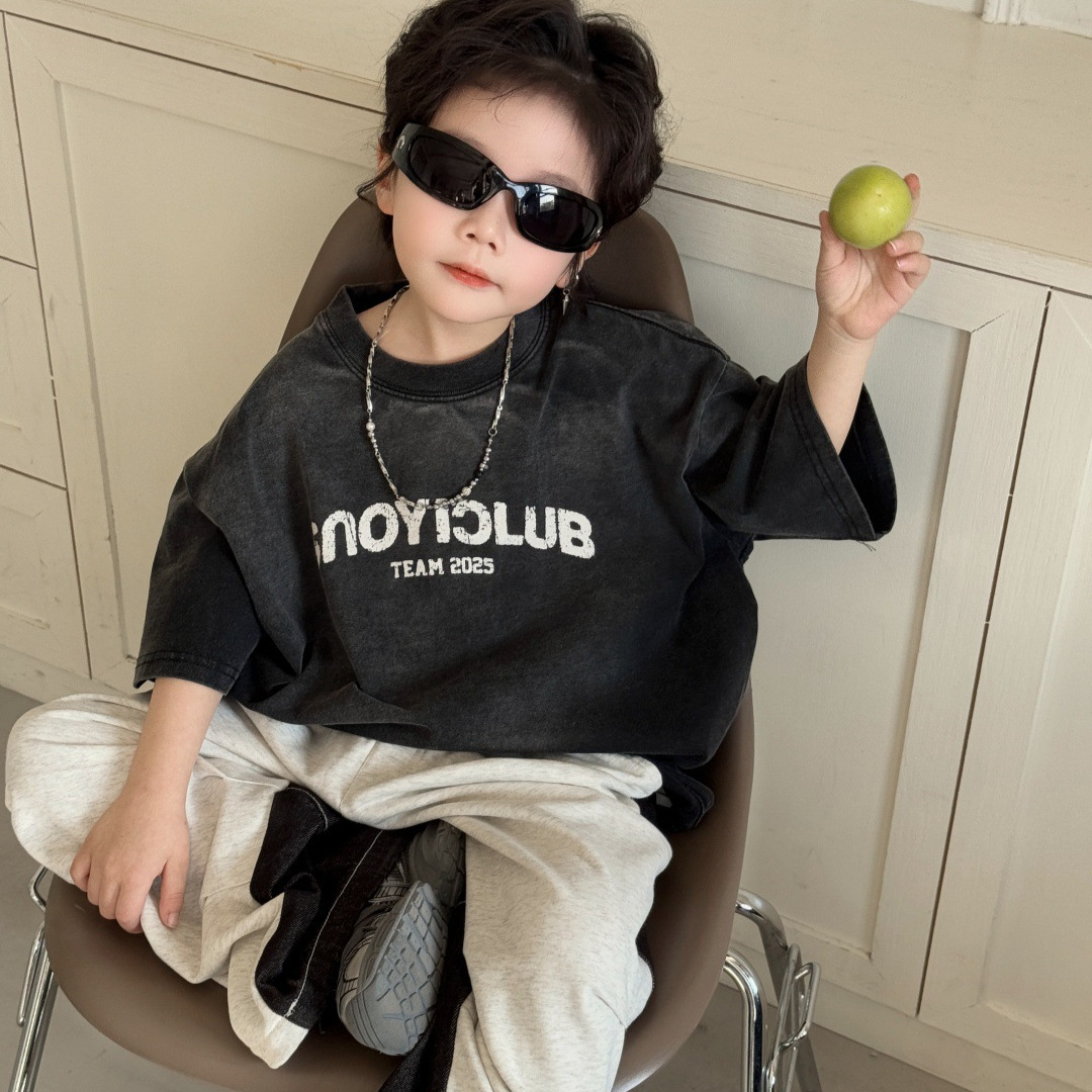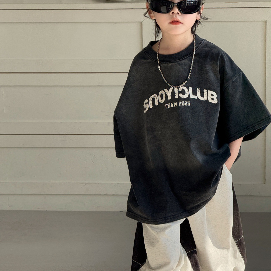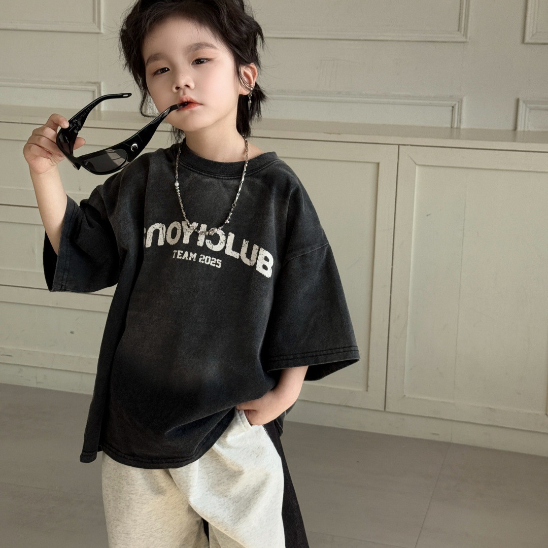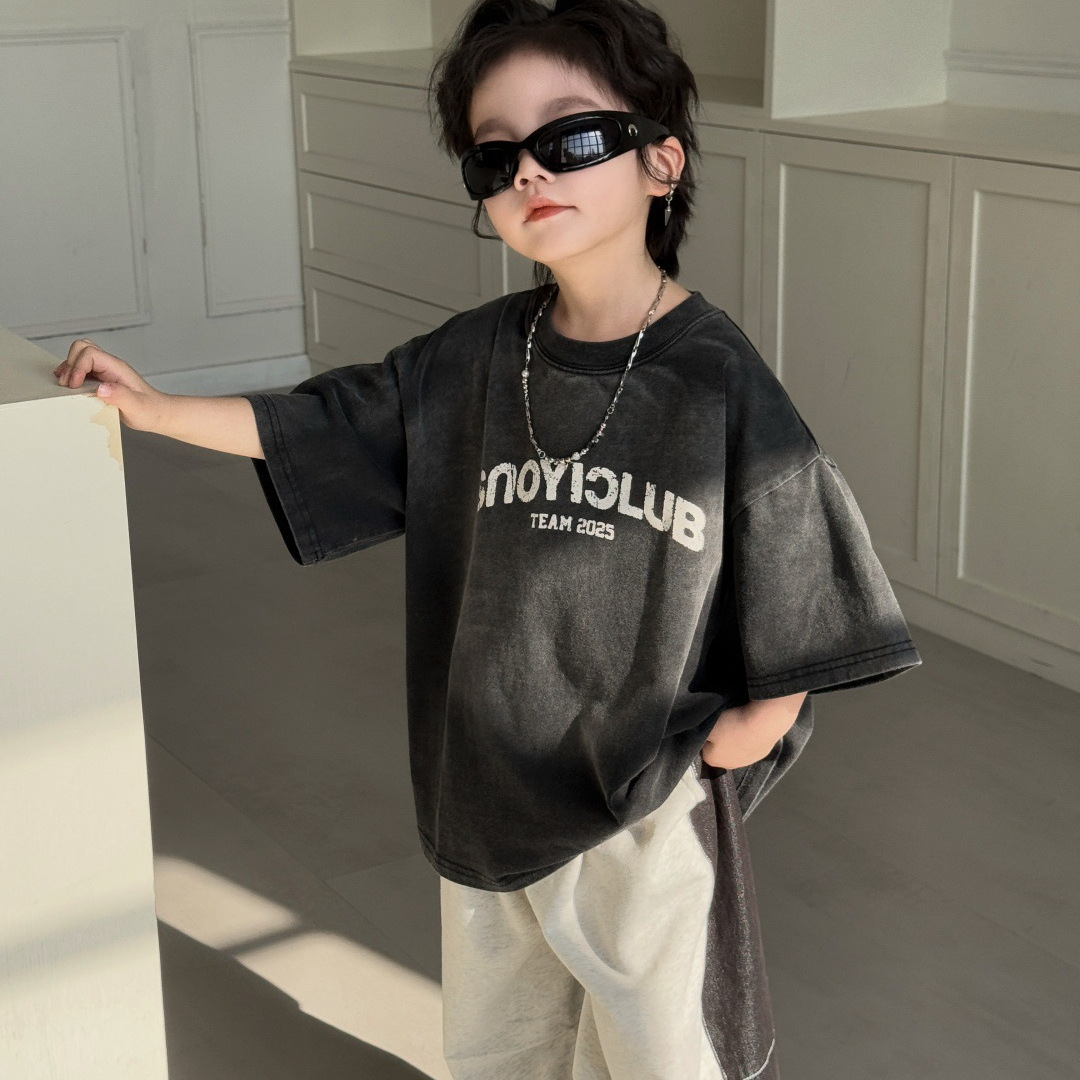 2025年夏季新款男童t恤洋气时尚吊染做旧洗褪色男宝宝上衣潮款酷