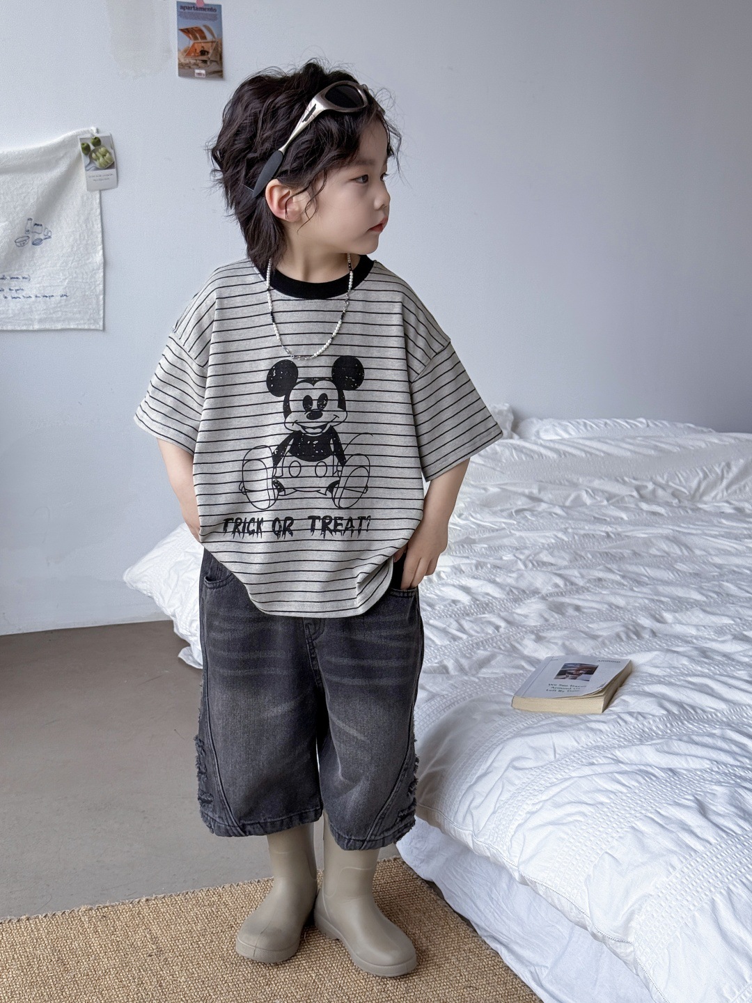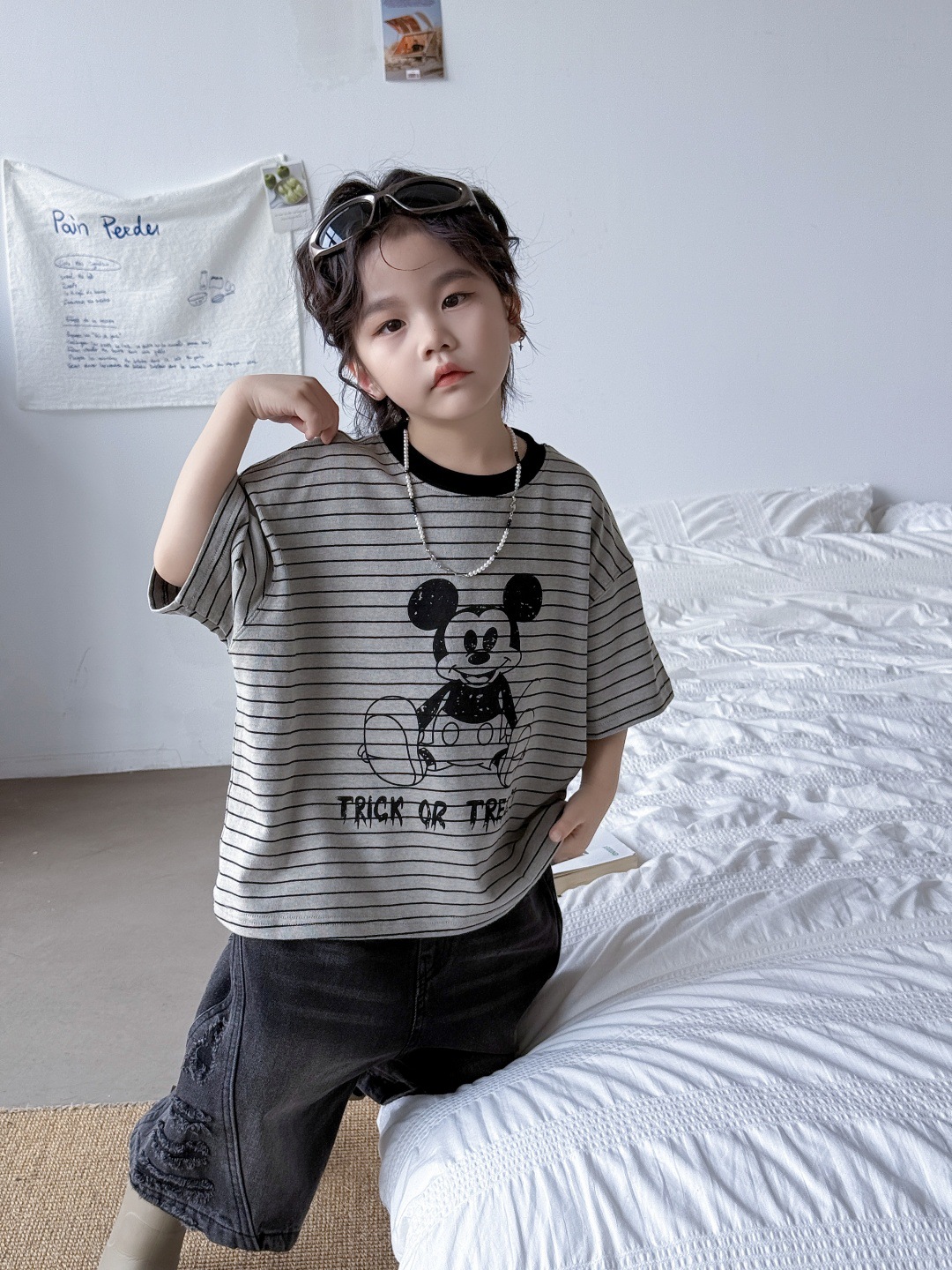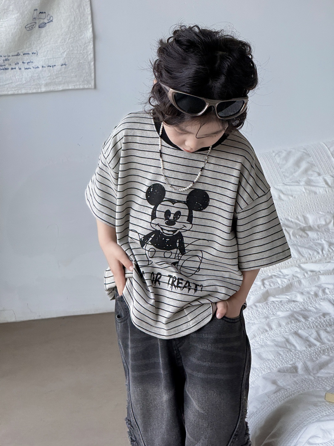 2025儿童T恤卡通条纹上衣米奇可爱上衣男童女童男孩男宝宝短袖潮