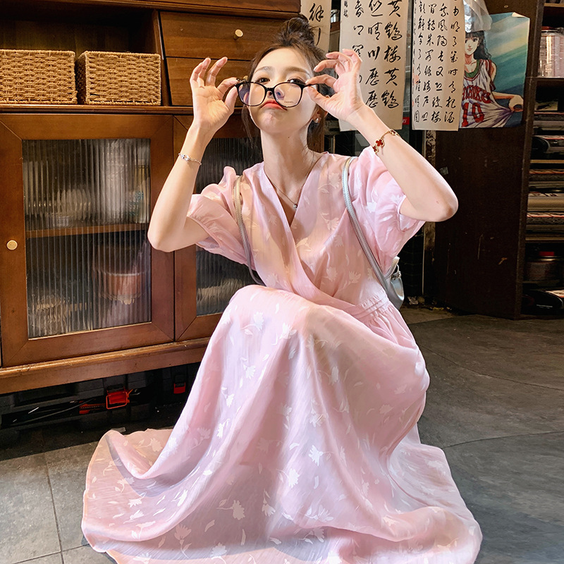 法式V领印花显瘦收腰连衣裙子甜美氛围感渡假风压皱碎花少女长裙