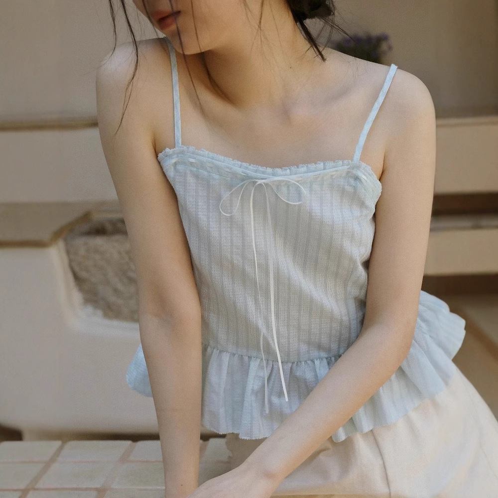 LANO 条纹波浪边吊带上衣复古法式海盐荷叶边背心内搭外穿女夏季
