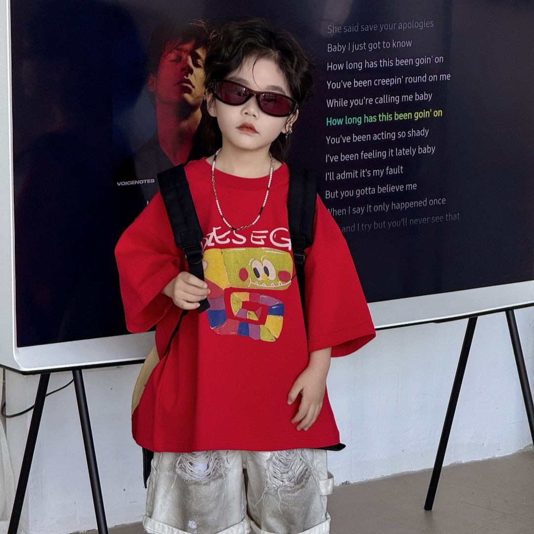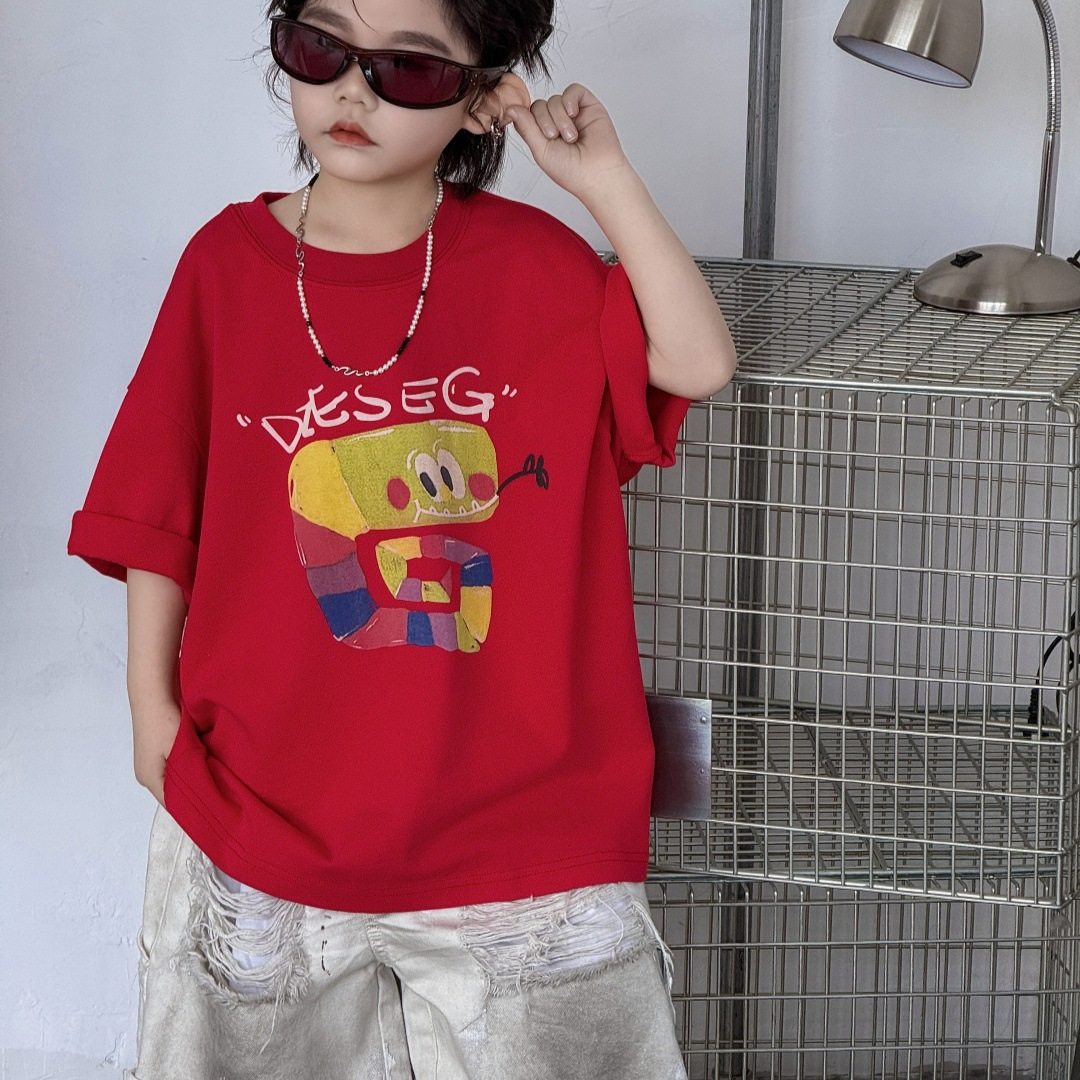 2025年夏季新款儿童短袖上衣男童女童红色洋气宽松纯棉圆领男孩