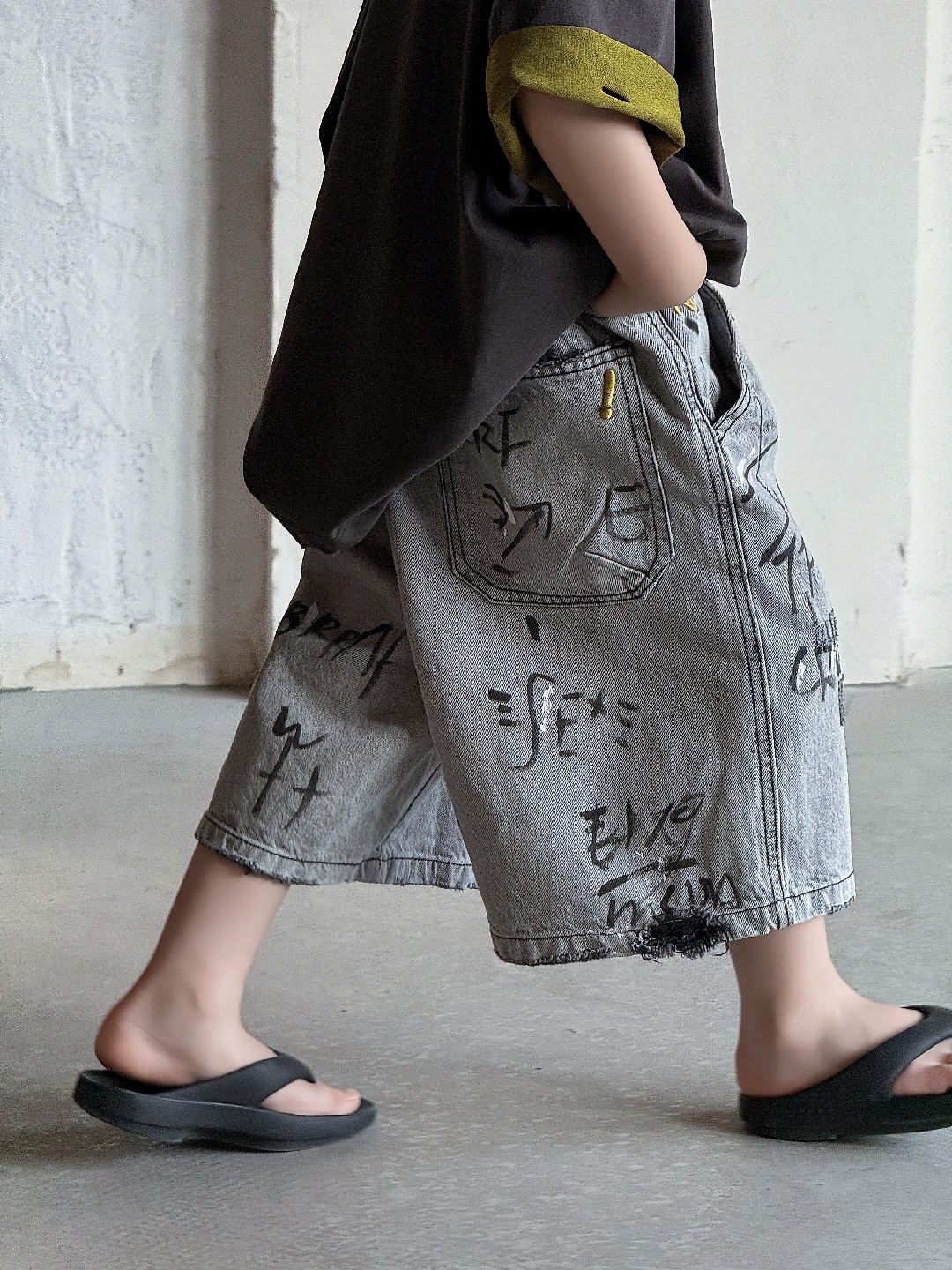 手绘涂鸦牛仔裤男童夏季男孩痞帅高级感裤子美式高街短裤中裤2025