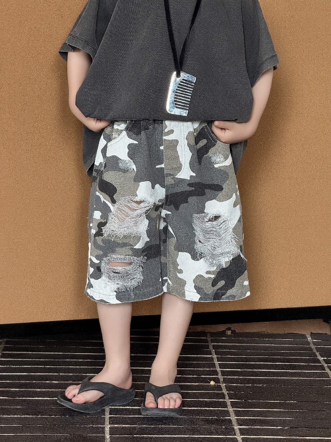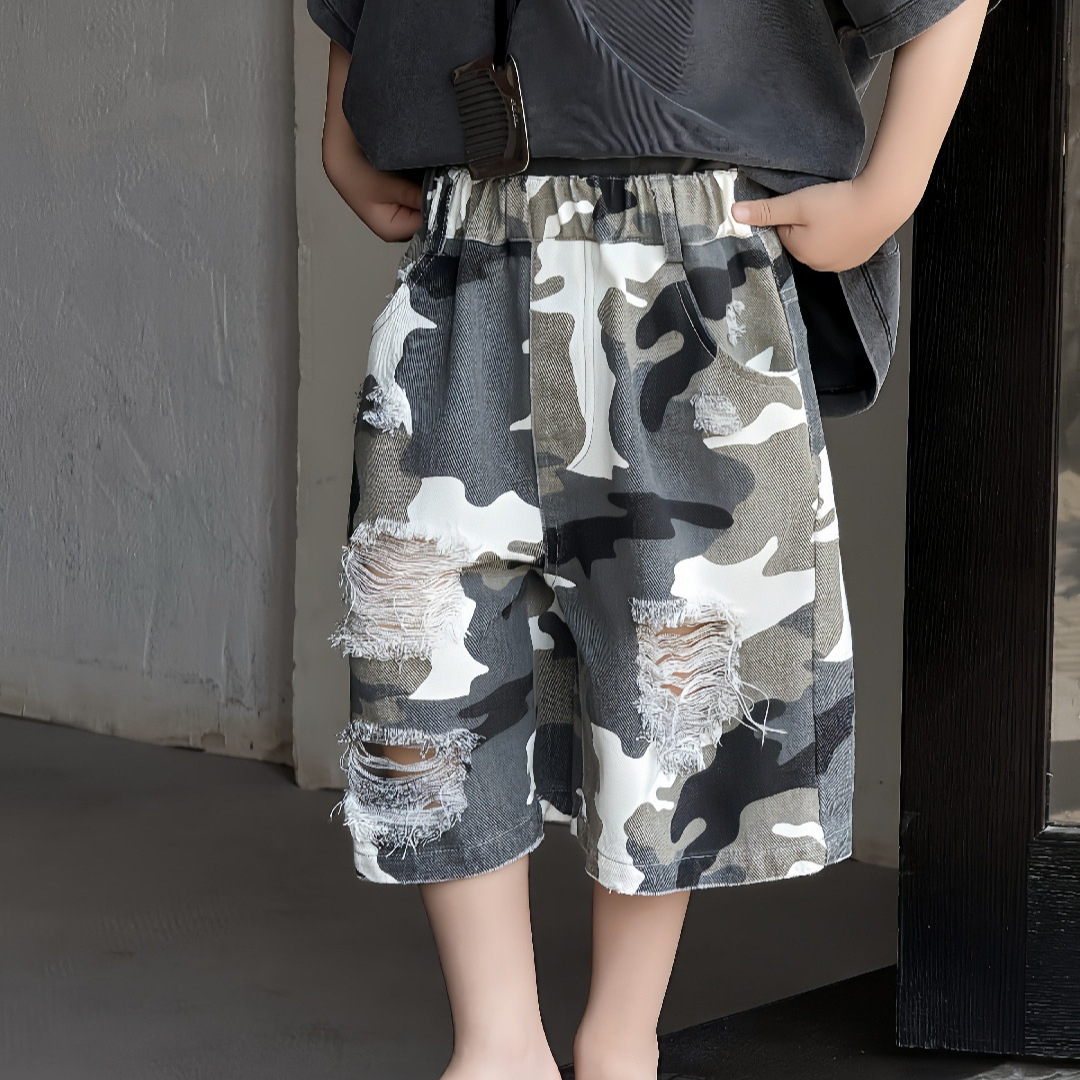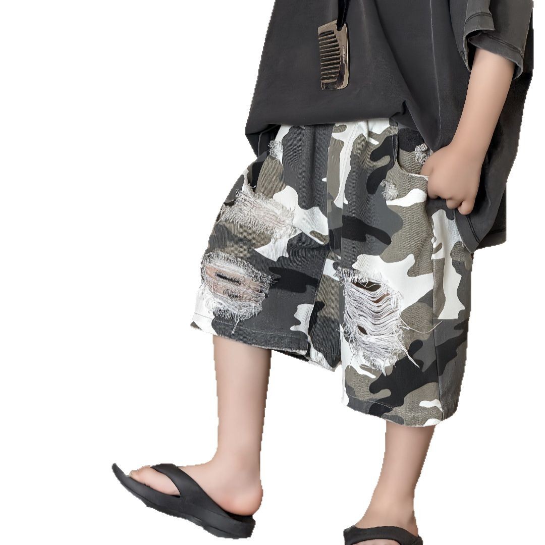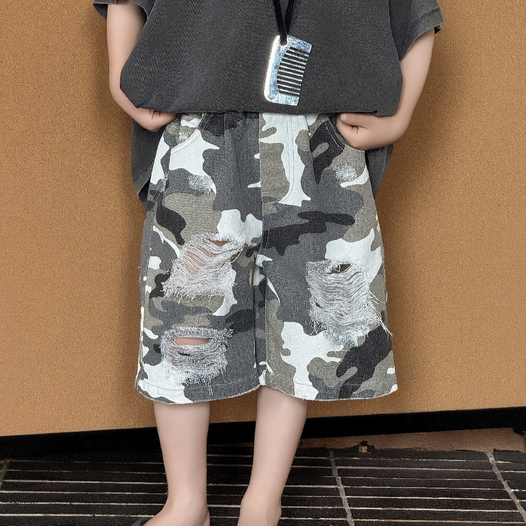 2025年男童夏季短裤迷彩破洞五分裤儿童美式高街直筒裤帅气潮酷