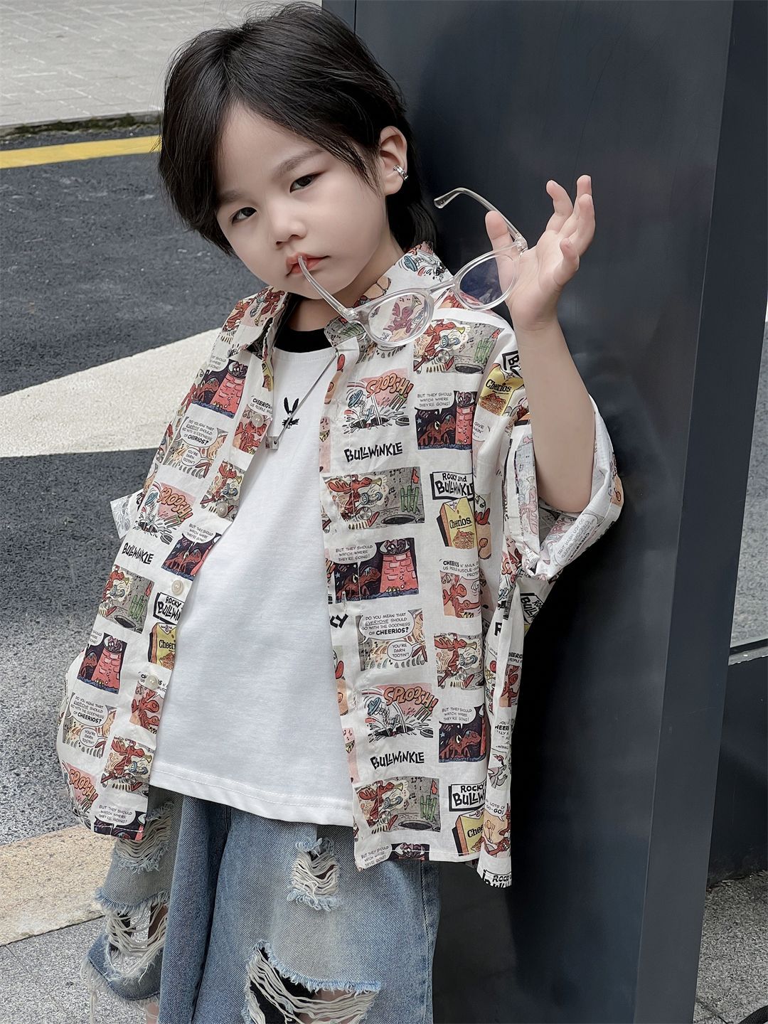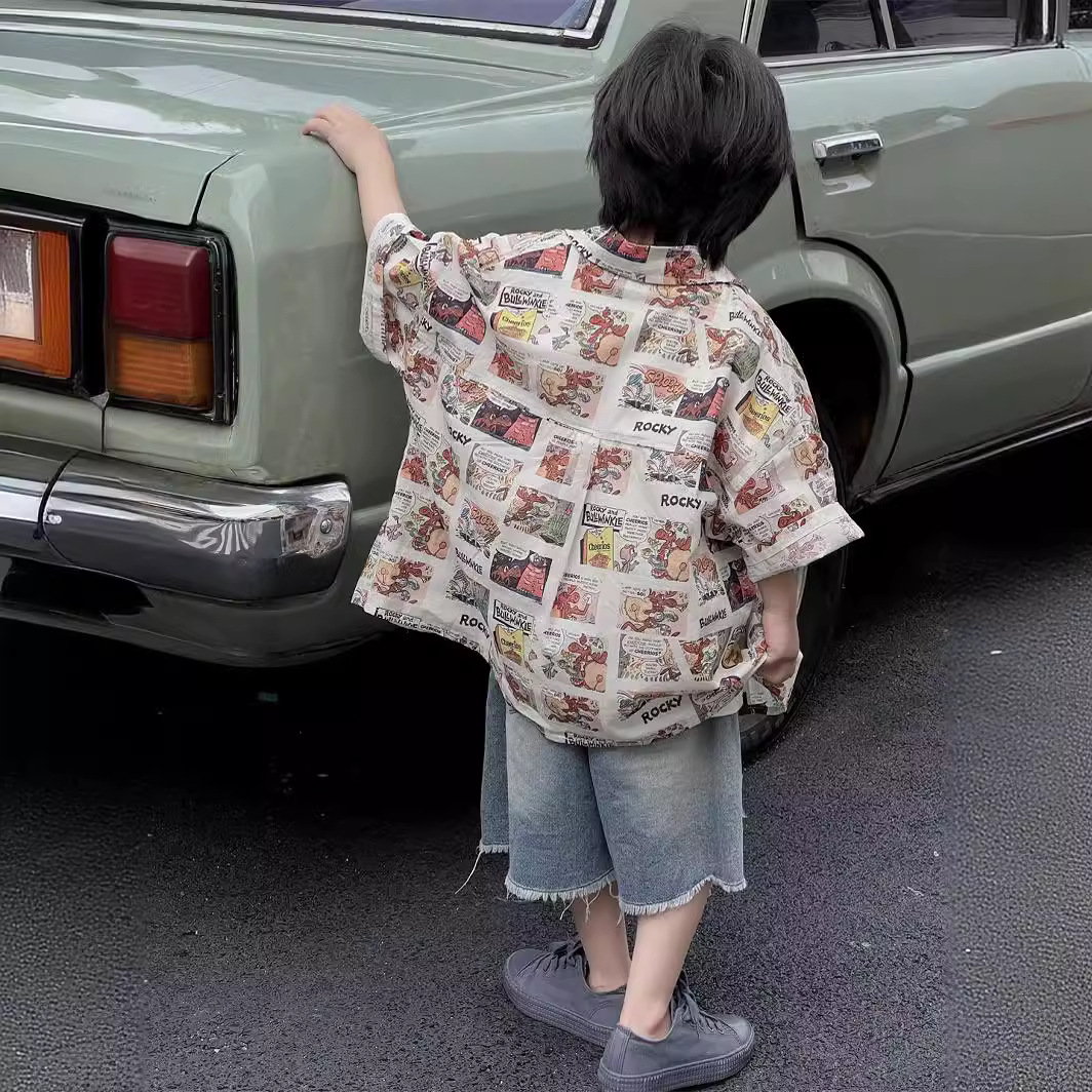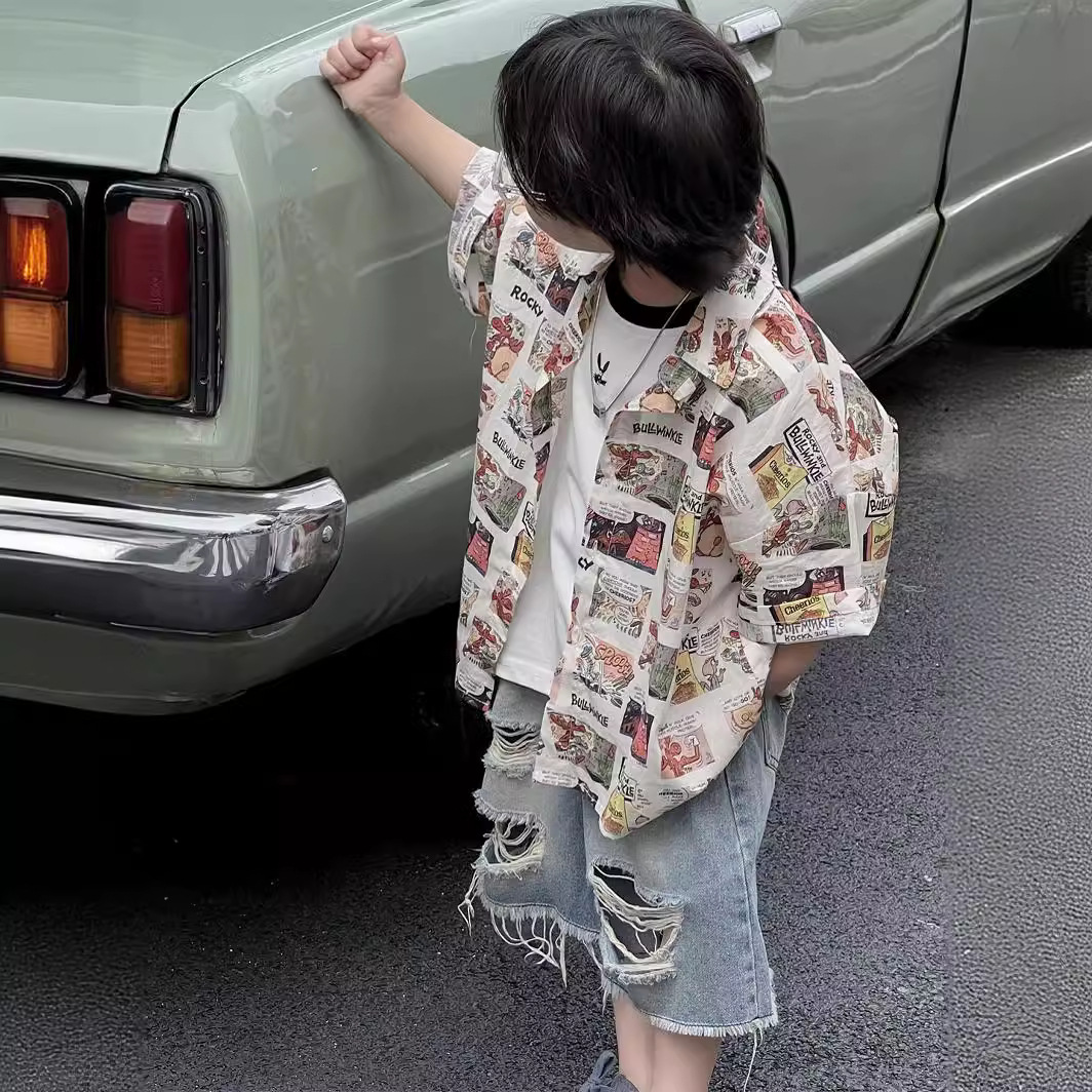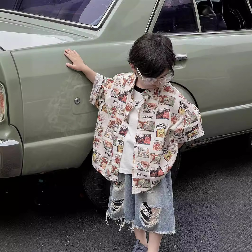 童装衬衫短袖夏季上衣翻领印花男童中小童潮酷男孩男宝宝
