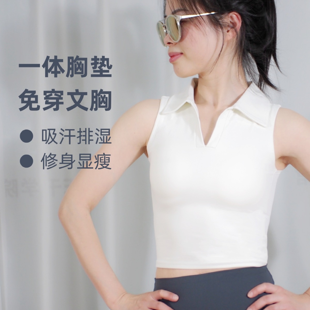 春夏速干翻领瑜伽背心女固定杯无袖跑步修身运动内衣外穿健身上衣