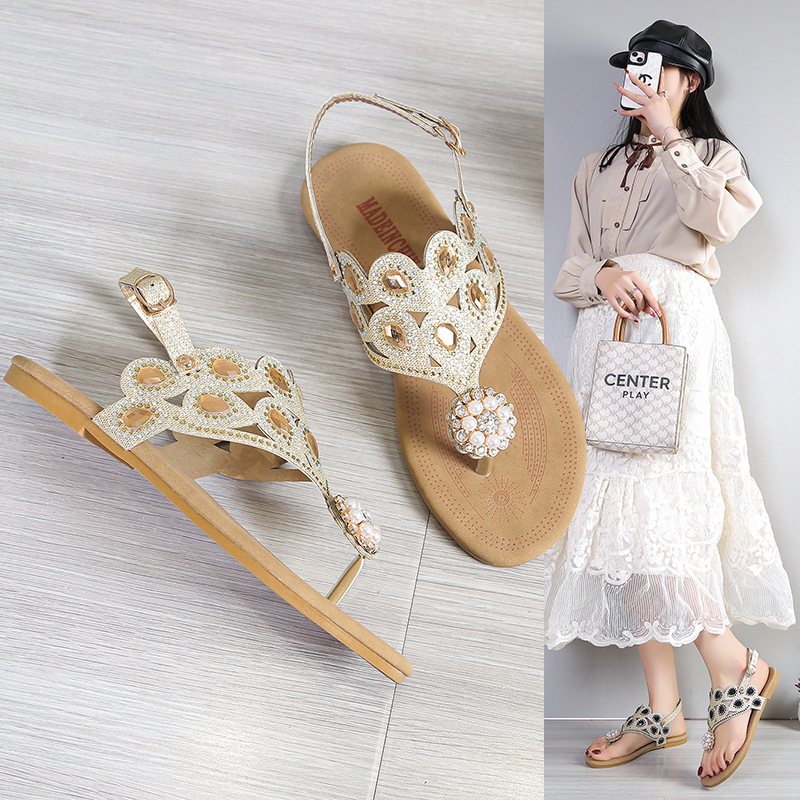 现货水钻珍珠夹趾T字带凉鞋女2025夏季新款透气度假外穿凉鞋