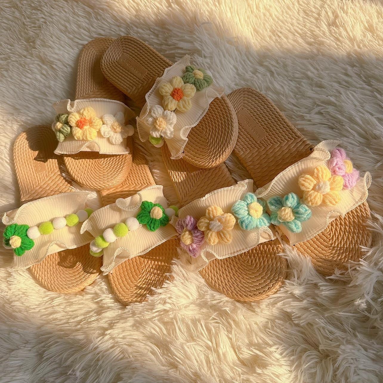新款仙女风坡跟人字拖女夏季时尚草编花朵厚底傣族鞋沙滩鞋凉鞋