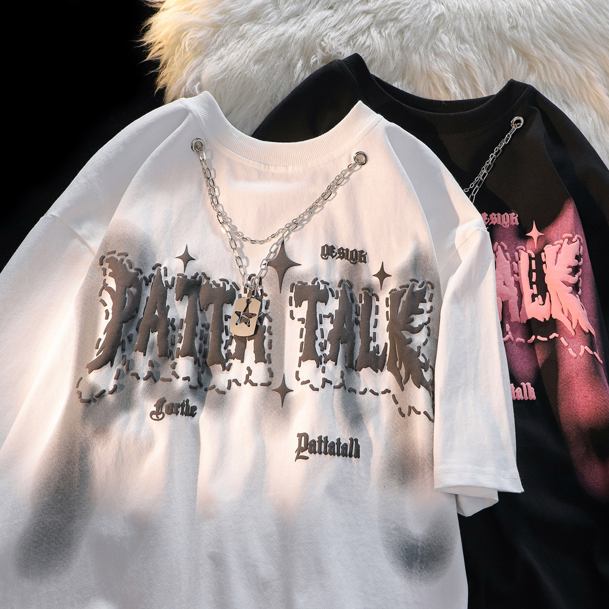 美式复古街头项链纯棉短袖t恤女宽松大版甜酷风潮牌半袖上衣