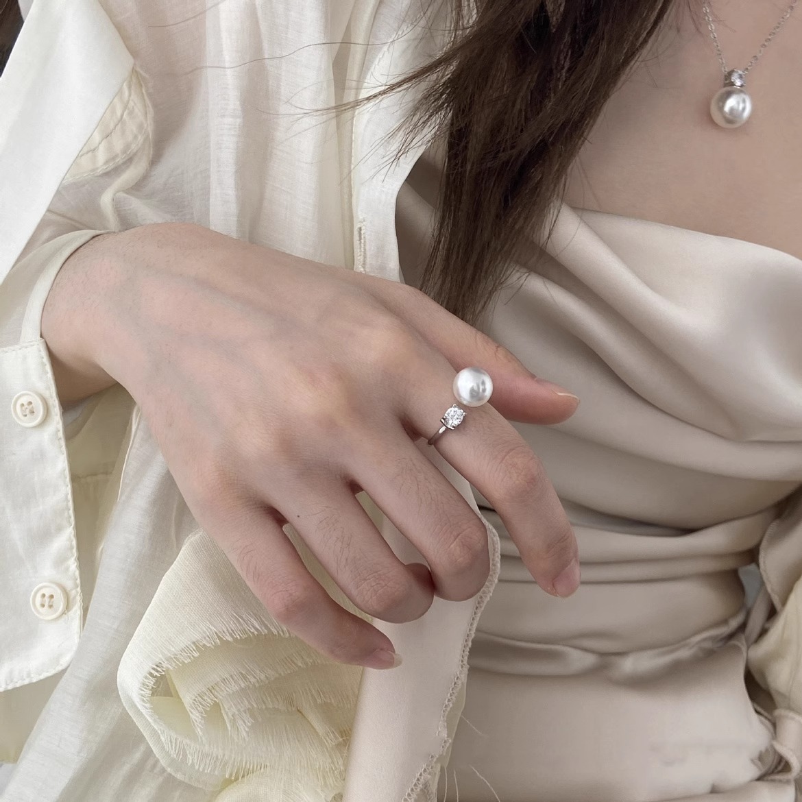 新款简约单颗锆石轻奢大溪地仿珍珠戒指时尚网红开口指环食指戒女