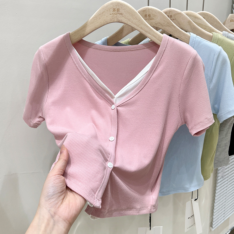 v领短袖t恤女ins潮新款假两件撞色短款高腰上衣