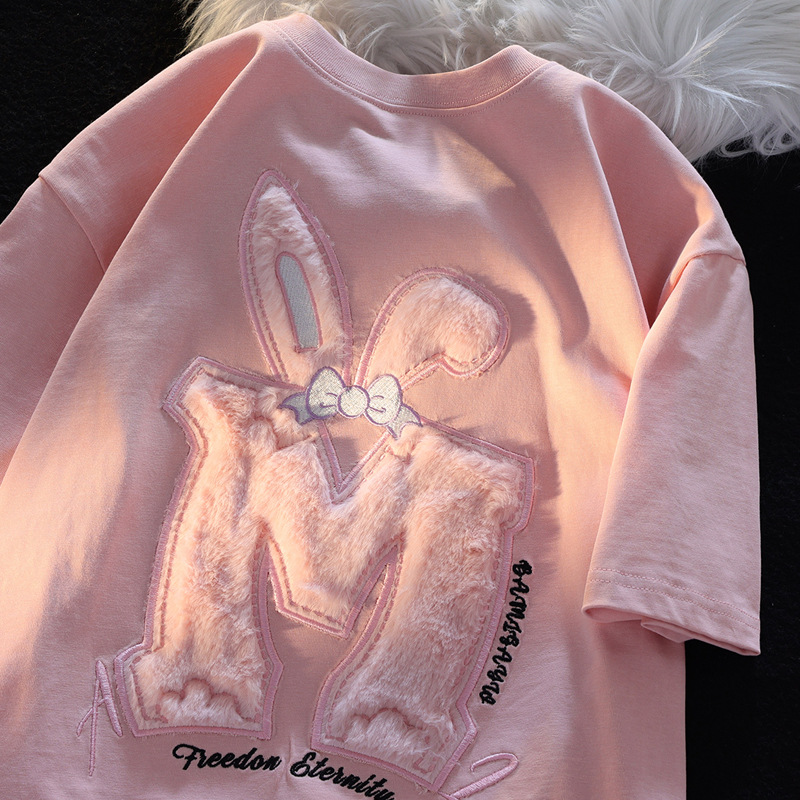 多巴胺纯棉毛绒M字短袖t恤女宽松夏季小众3D立体绣花BF风情侣上衣