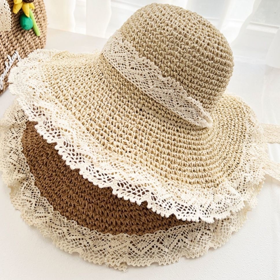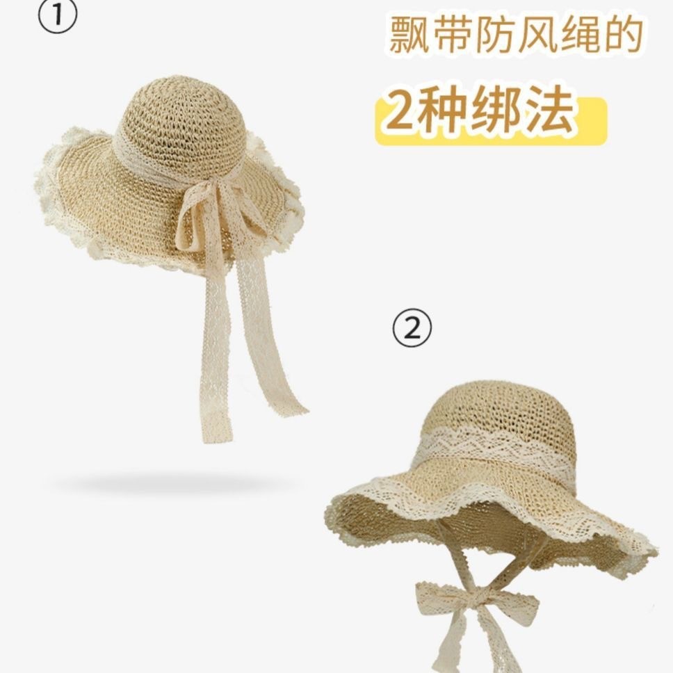 夏季蕾丝花边沙滩防晒帽女海边出游大帽檐遮阳帽防紫外线镂空草帽