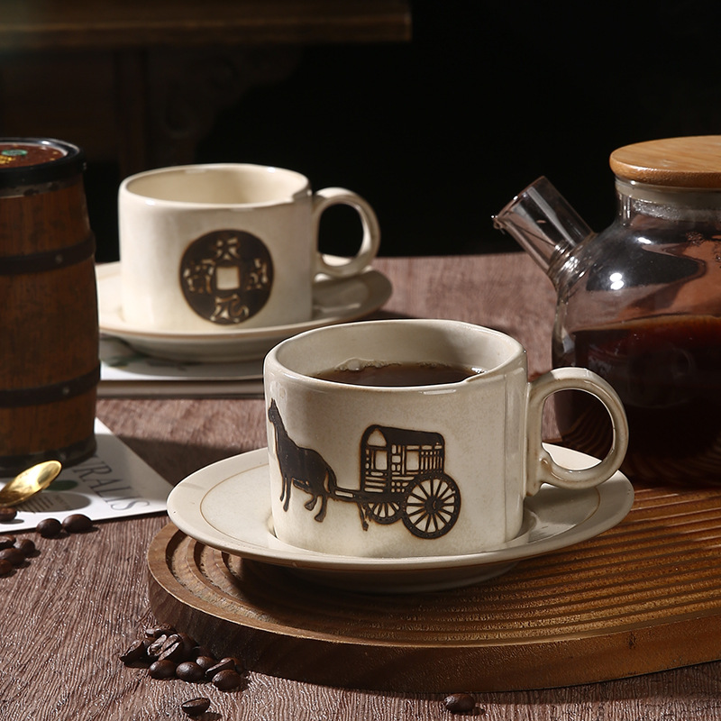古典咖啡杯碟办公室家用拉花杯复古马克杯创意文字浮雕牛奶咖啡杯